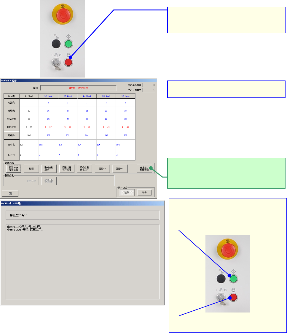 操作手册 I 3-22 5. 按一次[停止开关],会进入暂停状 态。再按一次,则显示中断画面。 6. 进入暂停状态,显示「暂停」画面。 *为了避免故障, 要进行安全盖的开闭时 请按[安全盖解除锁定]按钮。 7. 显示中断画面。 按[开始开关],则继续进行生产。 按[停止开关],则停止生产。