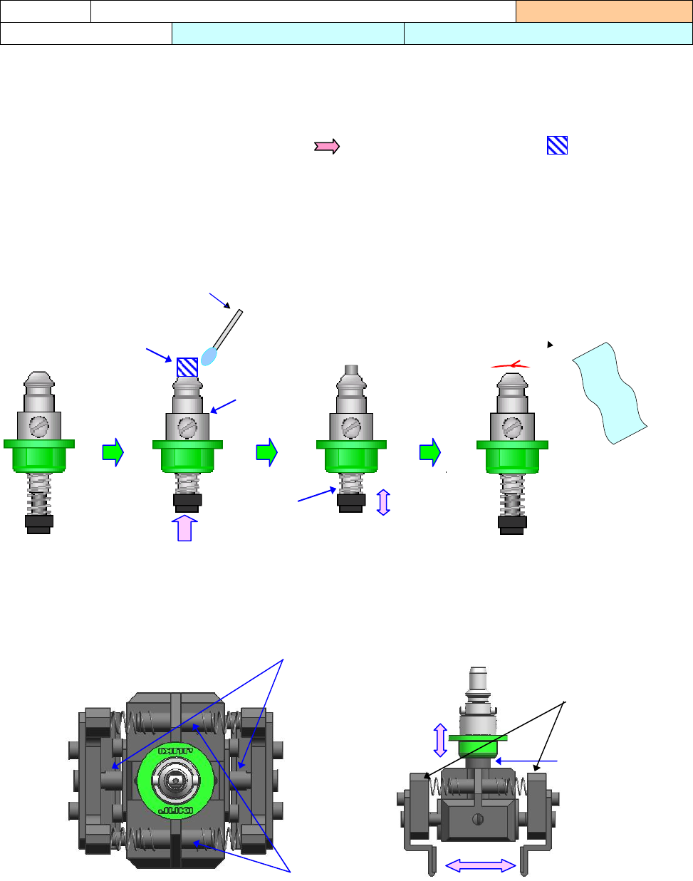 操作手册 I 4-21 吸嘴用超声波清洗后放置下来,会使吸嘴内圈生锈。 请按下列顺序,在吸嘴滑动部上油。 1) 清洗后,用气枪等把吸嘴内部的酒精吹干净。 2) 在图示的润滑油涂抹部分(把吸嘴滑动部向 方向推入时从吸嘴内圈蹦出的 部分), 用半湿的棉棒涂上一滴油。 3) 把吸嘴滑动部分上下滑动 20 ~ 30 次,使润滑油涂布均匀。 4) 用干净抹布,把吸嘴周围多余的油擦干净。 注油项目 吸嘴清扫后上油 实施频度 :每周 使用工具 :气枪…