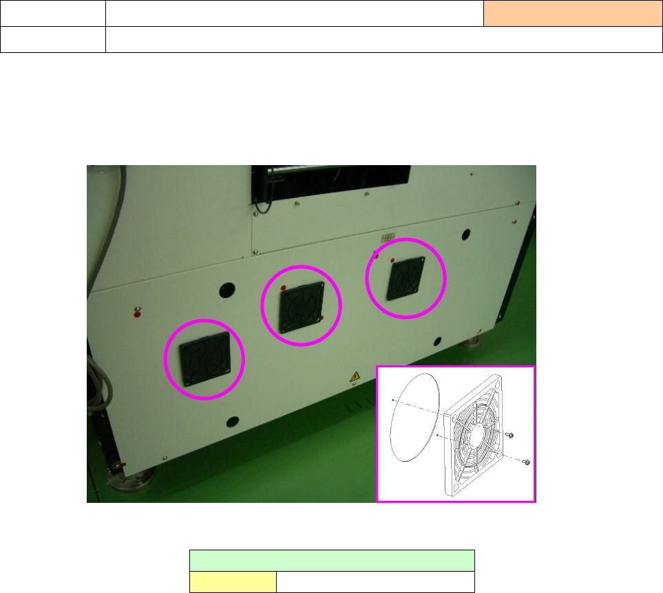 操作手册 I 4-30 清扫部位 4-3-16 风扇马达过滤器 实施频度 :每 6 个月 清扫内容 清扫风扇马达过滤器脏污 <L 、 XL 基板规格 > 1 )请检查装置右侧面外壳上安装的风扇马达护罩(过滤器)的脏污。 2 )如果过滤器上附着明显的脏污(沾着垃圾和尘埃),请将护罩拆下,去除过滤器的脏污。 卸下螺钉( 2 处)即可拆下。 3 )如果过滤器的脏污很难去除,或者过滤器有损坏时,请用以下货号的过滤器进行更换。 风扇马…