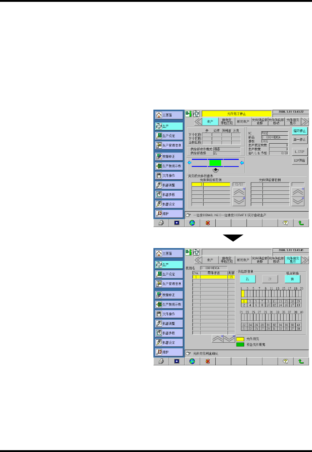 RG13 1 操作手册 5.4 元件的设定 DA7OCC- 31-070-A0 5.4- 3 2. 将编带元 件装到元件料 架上。 3. 请使用机 器调整菜单上 的手动进给功 能, 将编带 元件移动到元件 料架的端部。 = 提示 = 可一次同时使 10 个料架动 作。 元件料架 (供料器 ) 编带元件