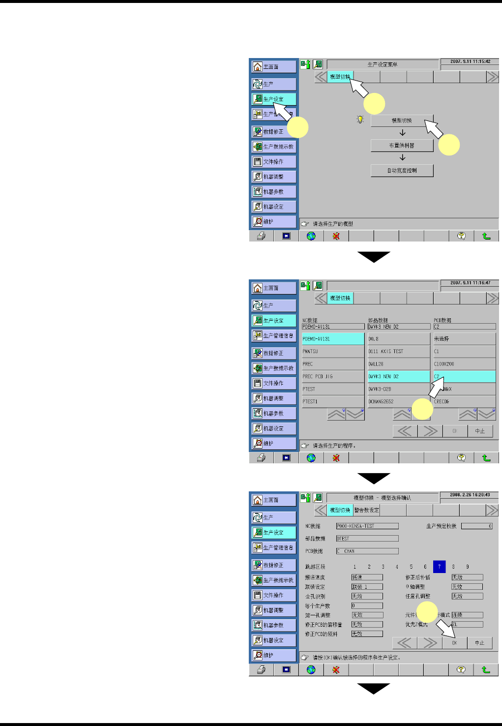 RG131 操作手册 5.1 生产 准备 DA7OCC-31-010- A0 5.1-16 5.1.6 基 板数据的选择 ( 选购 件 ) 使用自动宽度控制功能 ( 选购件 ) 时,需要事先在 模型切换画面选择基板数据 。 模 型切换 1. 1. 调出生产设定画面 按下 [ 生产设定 ] 。 2. 选择模型切换 按下 [ 模型切换 ] 。 3. 执行模型切换 按下 [ 模型切换 ] 。 显示数据选择画面。 选 择程序…