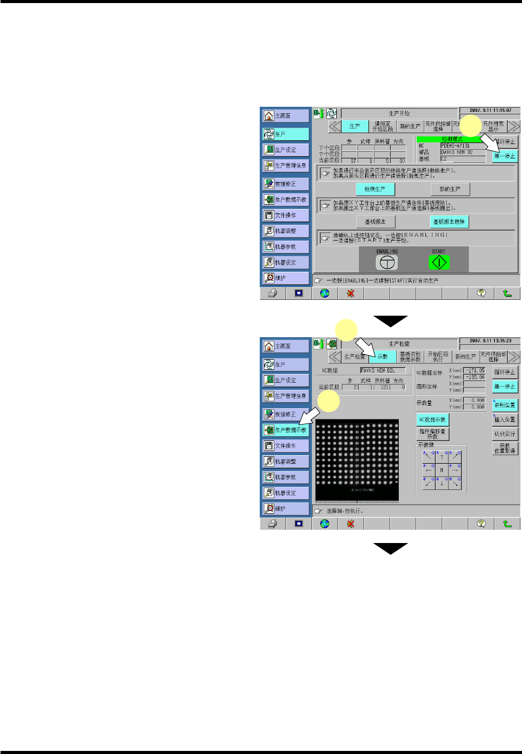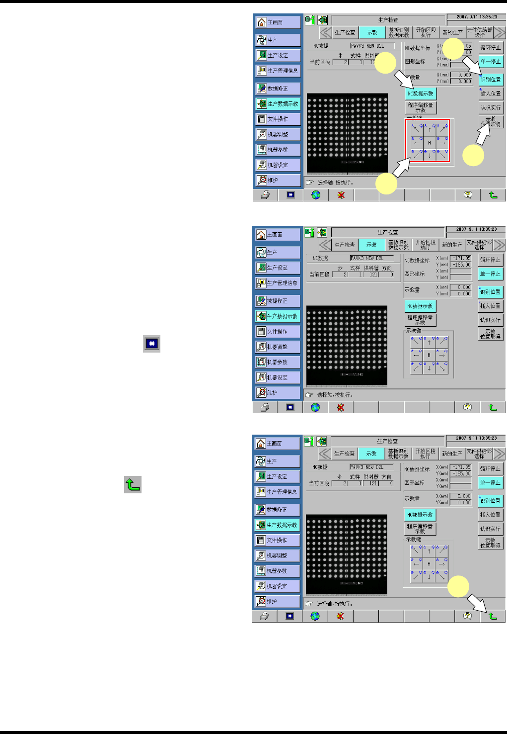 RG131 操作手册 5.2 生产 DA7OCC-31-040- A0 5.2-6 4. 选择 NC 示教模 式 (1) [ 按下 [NC 数据示教 ] 。 (2) 一边按 <ENAB LING ( 启动 )> 一边按 [ 识别位置 ] 。 (3) X-Y 工作台移到摄象机下面 。 (4) 在左下角的识别 画面,确认基板上的插 入点, 一边按住操作盘上的 <ENABLING ( 启 动 )> 按钮 , 一边按动示…