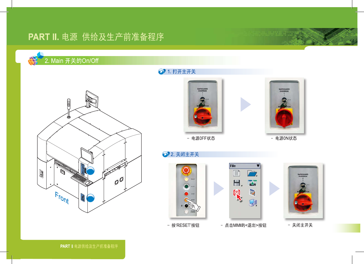 SM 3 21 (F ) Op er a t io n H a nd bo ok 13 1 A I R P R E S S U R E R E G U L A T O R S A F E G U O V E R R I D E M A I N S W I T C H 2 PART II . 电 源 供 给 及 生 产 前 准 备 程 序 2 . Main 开关的 On / Off & 1 . 打开主开关 - 电 源 OFF 状 …