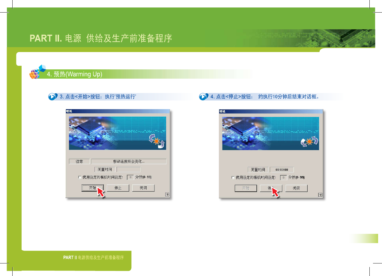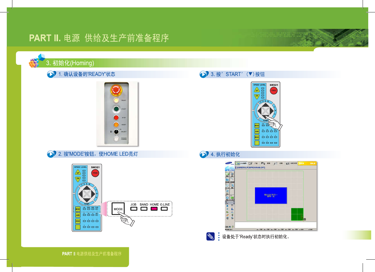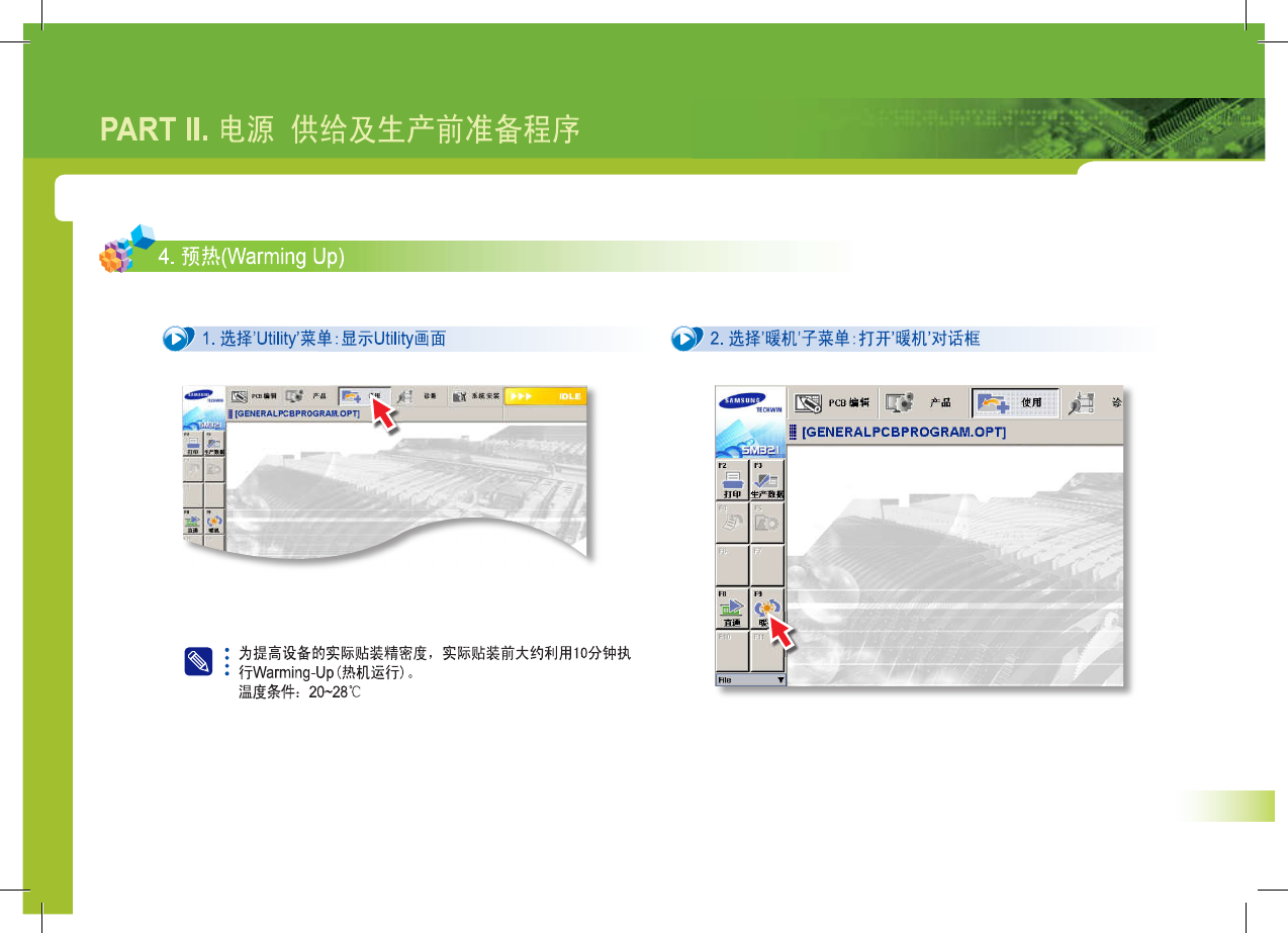 SM 3 21 (F ) Op erat io n Ha nd bo ok 18 PART II . 电 源 供 给 及 生 产 前 准 备 程 序 • ' 4 . 预热 ( Warming Up ) 1 . 选择 ’ Utility ’ 菜单 : 显示 Utility 画面 2 . 选择 ’ 暖机 ' 子菜单 : 打开 ’ 暖机 ’ 对话框 | [ GENEKALPCBPKOGRAM . OPT ] \ pf kK…