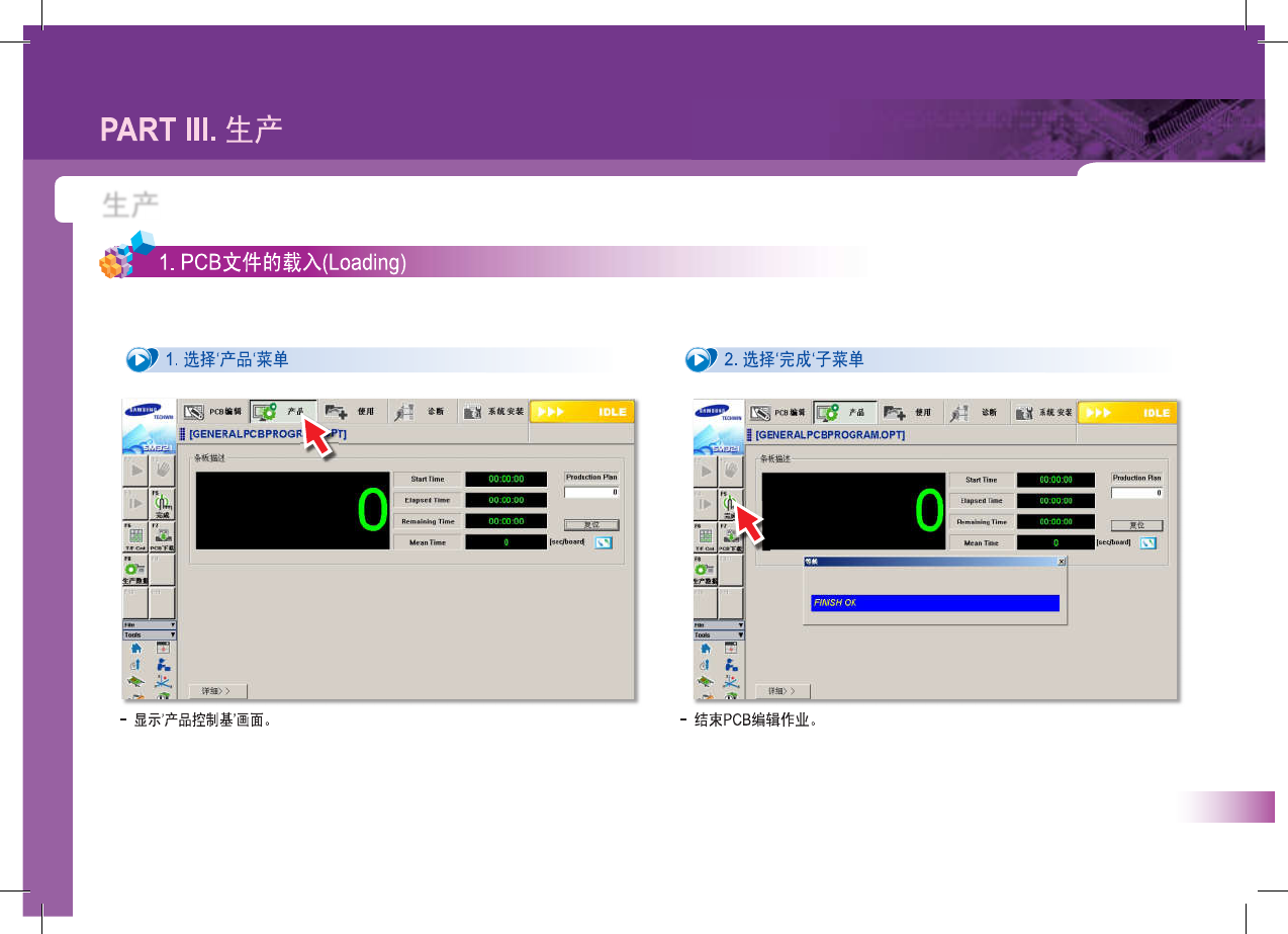 SM 3 21 (F ) Ope rat io n Ha nd bo ok 28 生产 PART III . 生产 1 . PCB 文件的载入 ( Loading ) 1 2 . 选择 ‘ 完成 ‘ 子菜单 . 选择 ‘ 产品 ‘ 菜单 ft . K * « * * 衫 * « * * 1 [ GENERALPCBPR 3 ( GENERALPCBPROGRAM . OPT ] \ \ SL " 圍 k » « CM WJf …