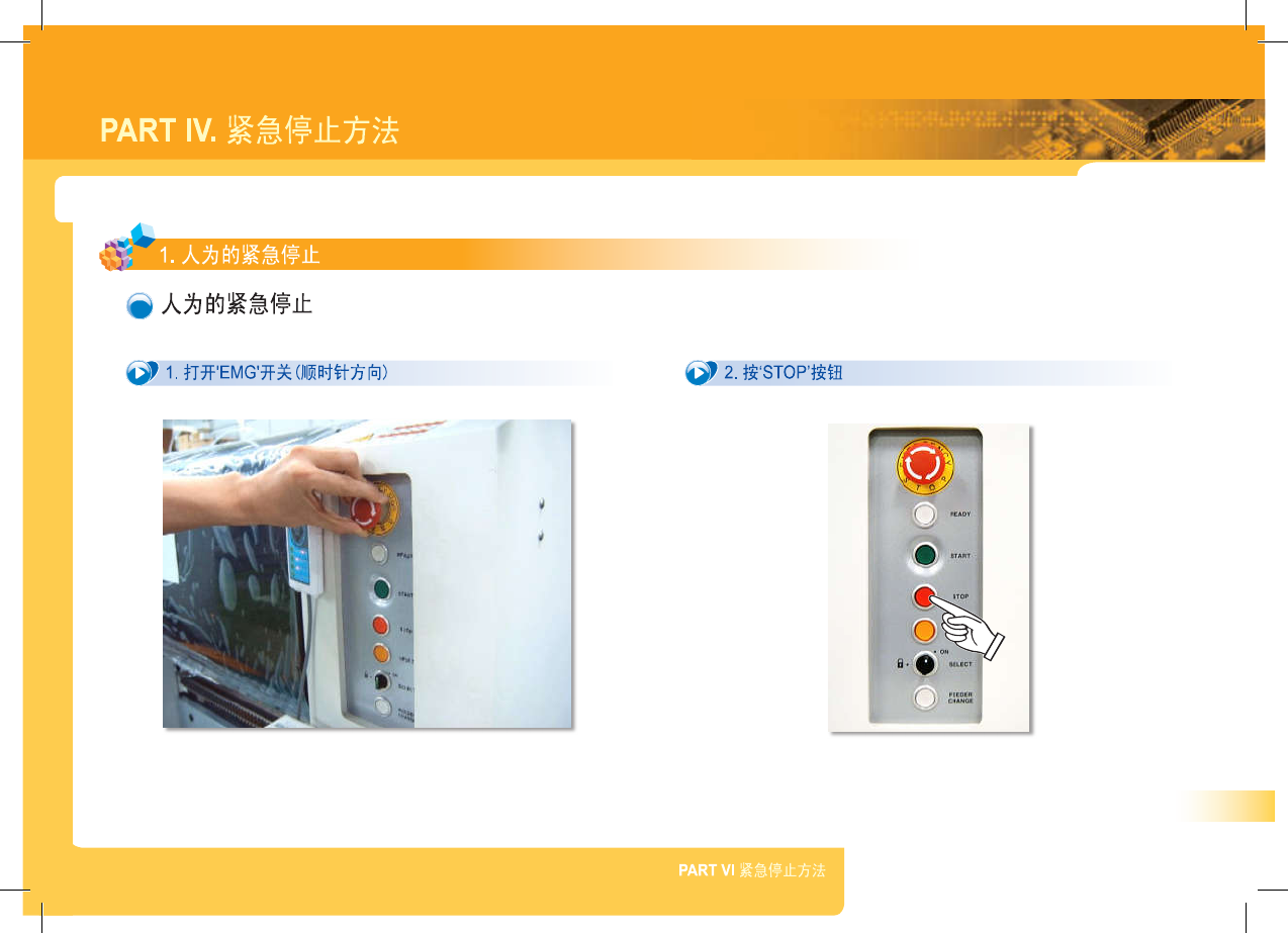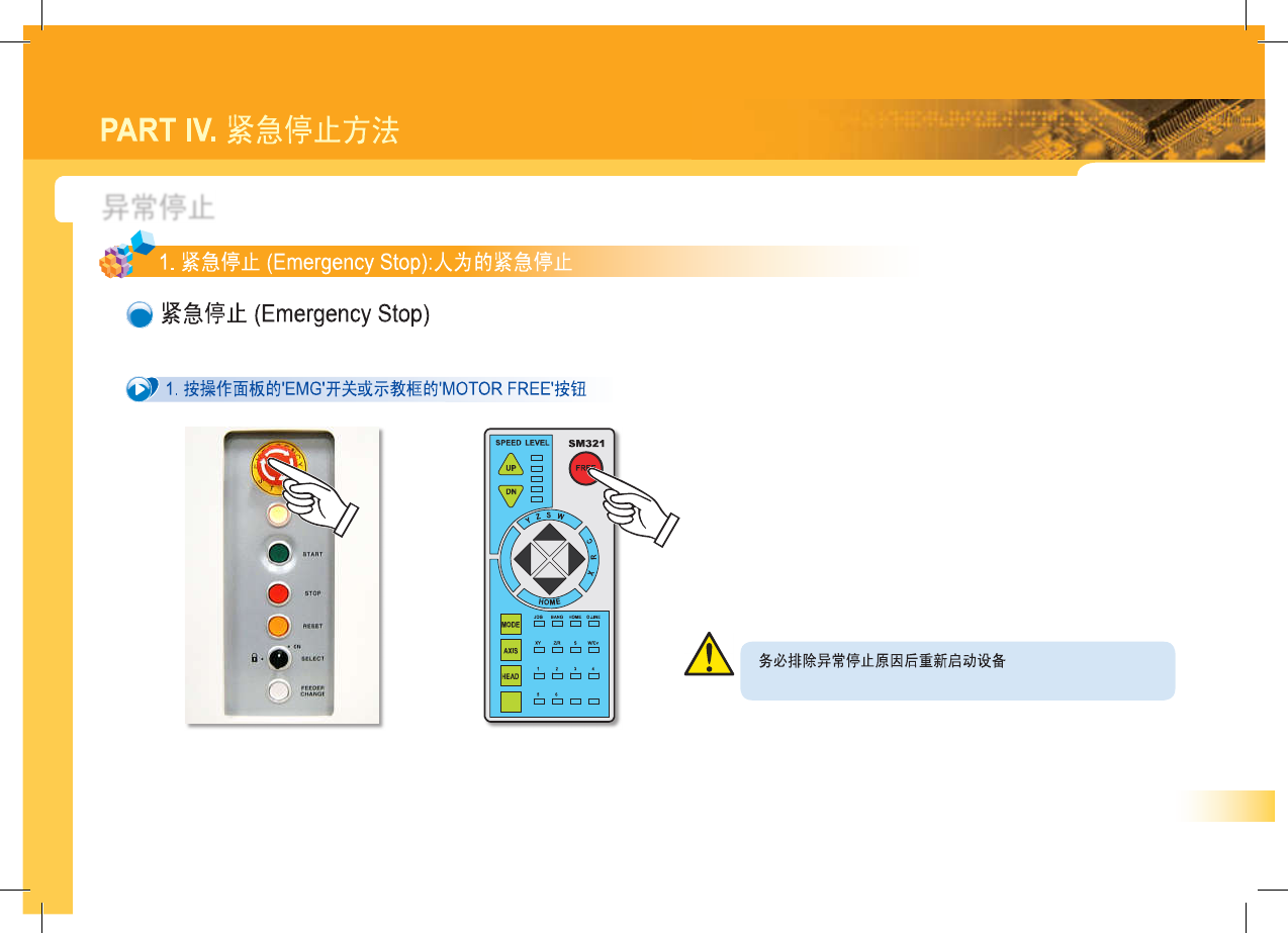 SM 3 21 (F ) Op er a t io n H a nd bo ok 38 异常停止 警 告 1 PART IV . 紧急停止方法 e . 常停 it 7 T 1 . 紧急停止 ( Emergency Stop ) : 人为的紧急停止 @ 紧急停止 ( Emergency Stop ) 1 . 按操作面板的 _ EMG _ 开关或示教框的 ' MOTOR FREE ' 按钮 SM 321 A ° 鬱 Q …