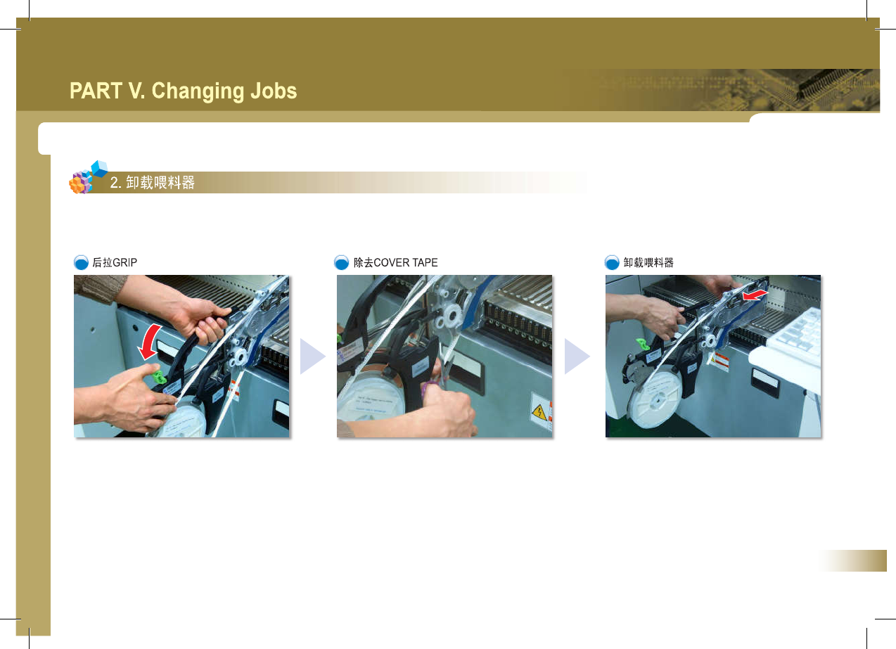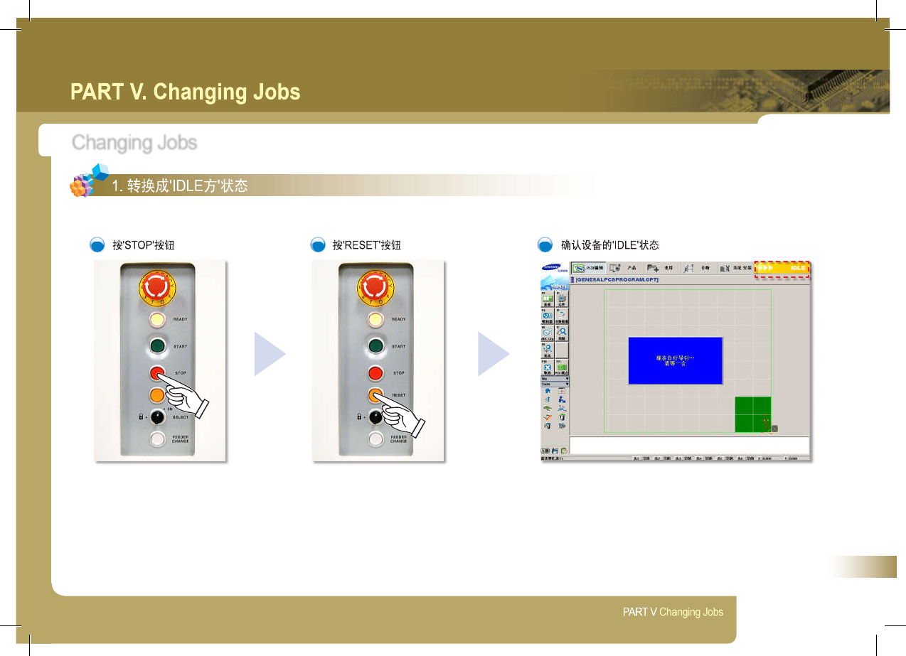 45 SM 3 21 (F ) Op er a t io n H a nd bo ok C h a ng i n g J ob s 1 2 3 % 确认设备的 ' IDLE ’ 状态 … | ' S ; , 1 按 ' STOP 按钮 按 KESET ' 按钮 ' — — ^ ' 參 [ > • M % CBPKOGRAM . OPT ) • ^ PART V Chang…