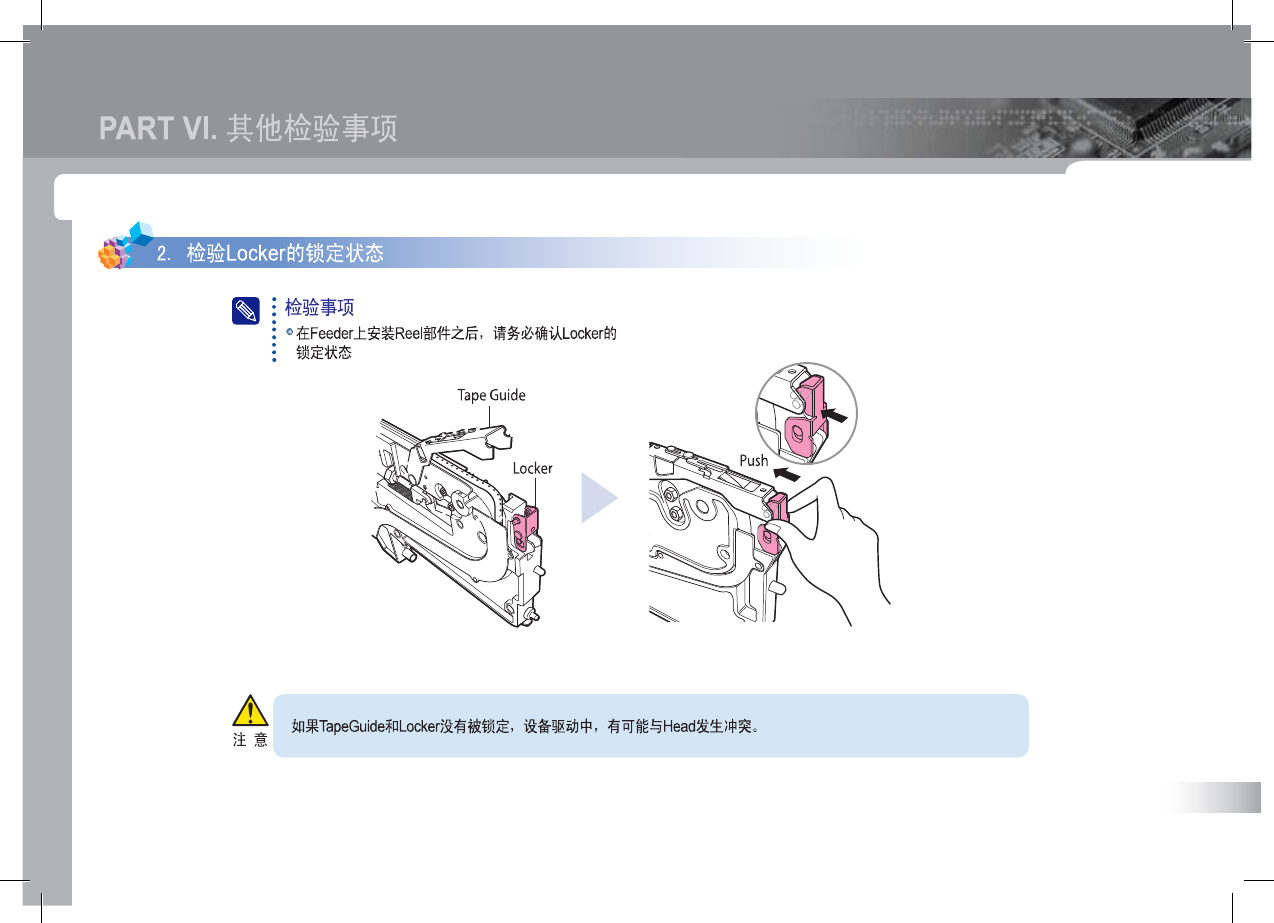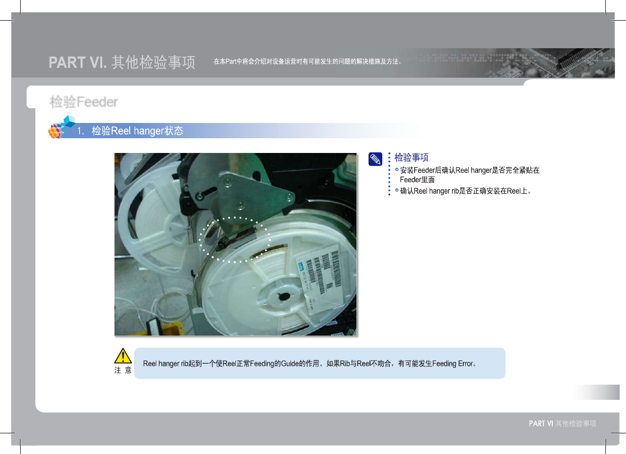 SM 3 21 (F ) Op erat io n Ha nd bo ok 49 检 验 Fe e d e r 獅 X PART VI . 其他检验事项 在本 Part 中将会介绍对设备运营时有可能发生的问题的解决措施及方法 。 . 检验 Reel hanger 状态 驪 检验事项 ° 安装 Feeder 后确认 Reel hanger 是否完全紧贴在 Feeder ■ 里面 ° 确认 Reel hanger rib 是否正确安装在 R…