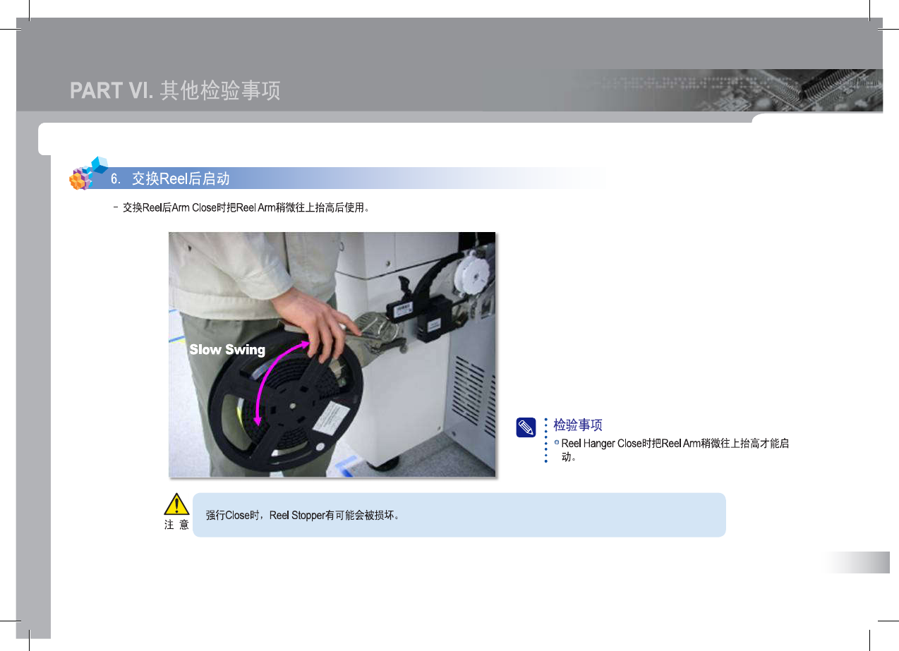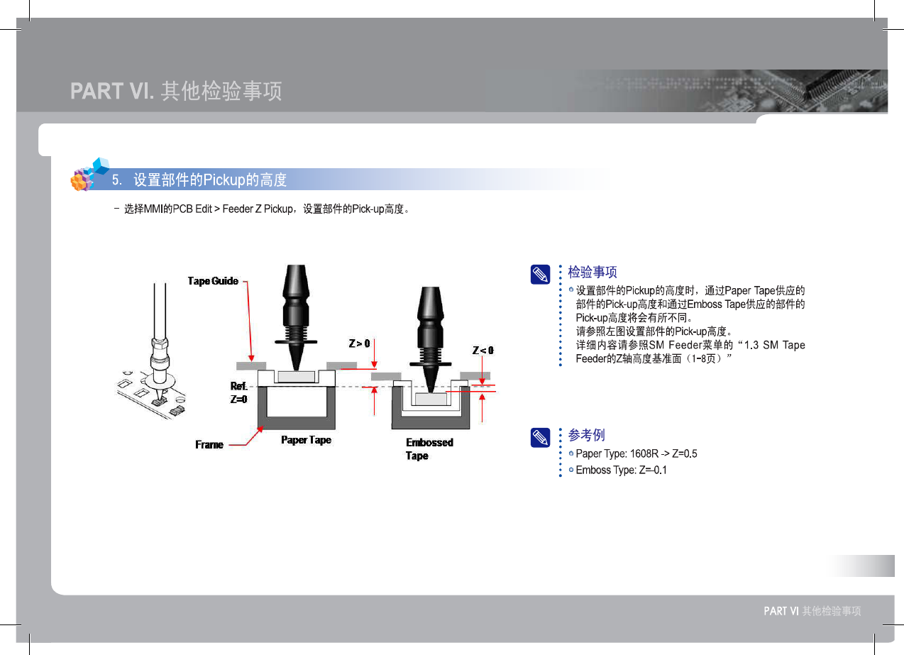 SM 3 21 (F ) Op erat io n Ha nd bo ok 53 PART VI . 其他检验事项 [ = 5 . 设 置 部 件 的 Rckup 的 高 度 - 选择 MMI 的 PCB Edit > FeederZ Pickup , 设置部件的 Pick - up 高度 。 : 检验事项 : 。 设置部件的 Pickup 的高度时 , 通过 Paper Tape 供应的 : 部件的 Pick - up 高 ik…