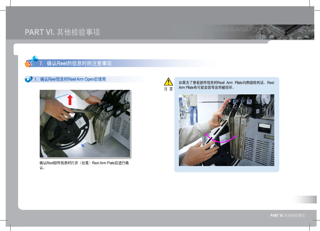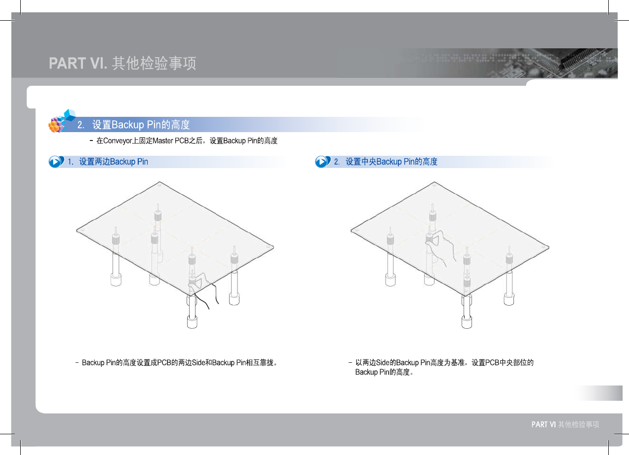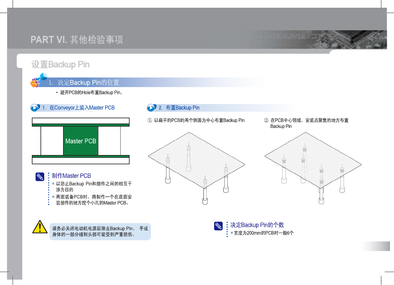 SM 3 21 (F ) Op erat io n Ha nd bo ok 56 设 置 B ac k u p P i n 警 告 PART VI . 其他检验事项 . 决定 Backup Pin 的位置 - 避开 PCB 的 Hole 布置 Backup Pin 。 2 . 布置 Backup Pin ① 以扁平的 PCB 的两个侧面为中心布置 Backup Pin 在 Conveyor 上装入 Master PCB ② 在 PCB …