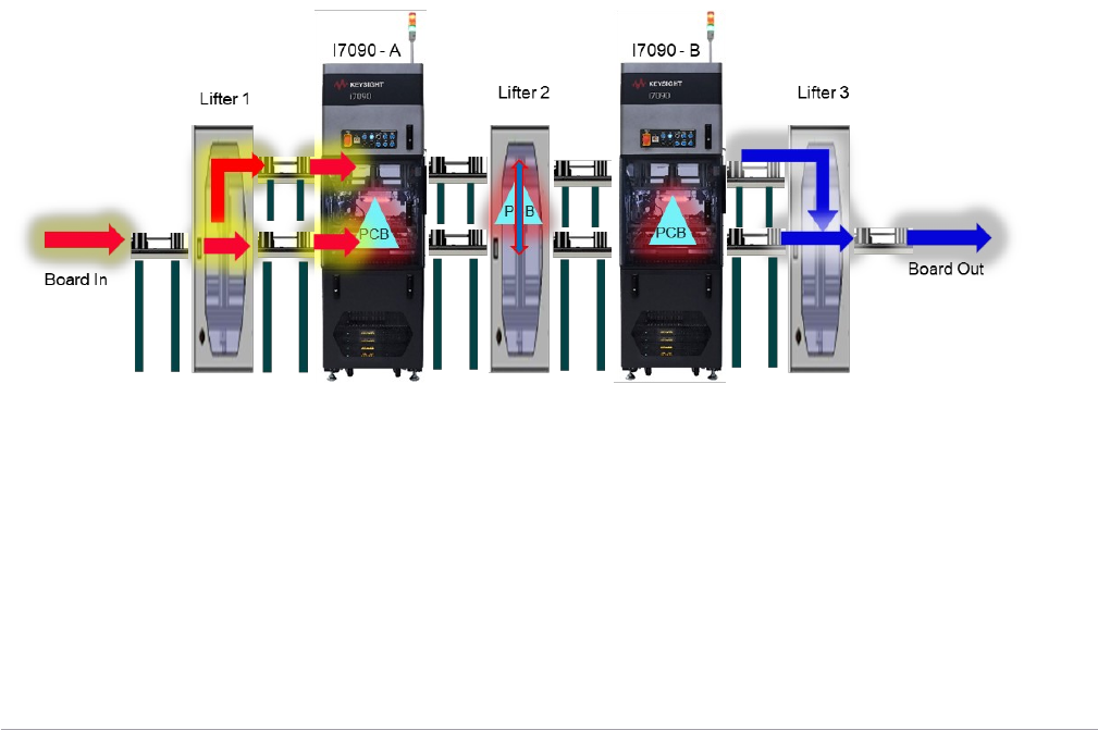Upon completing the first PCB test in i7090-A, lifter-2 will transport it to the bypass link in i7090-B, and