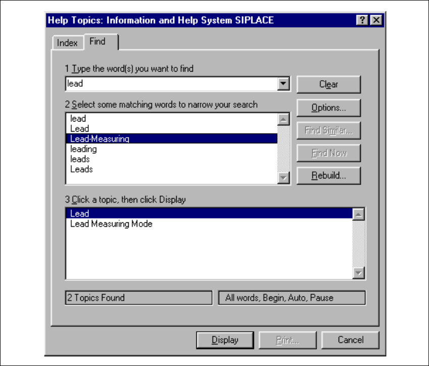 SIPLACE S oftware Guide SR.503.xx 6 Online help system Issue 12/01 E N 6.1 General 85 6 Fig. 6.1 - 10 "Help T opics " window (Find) 6 6