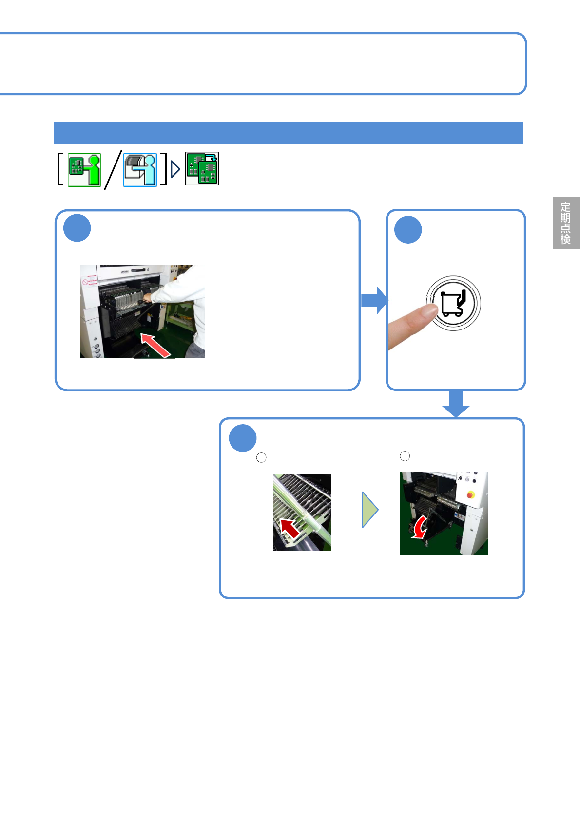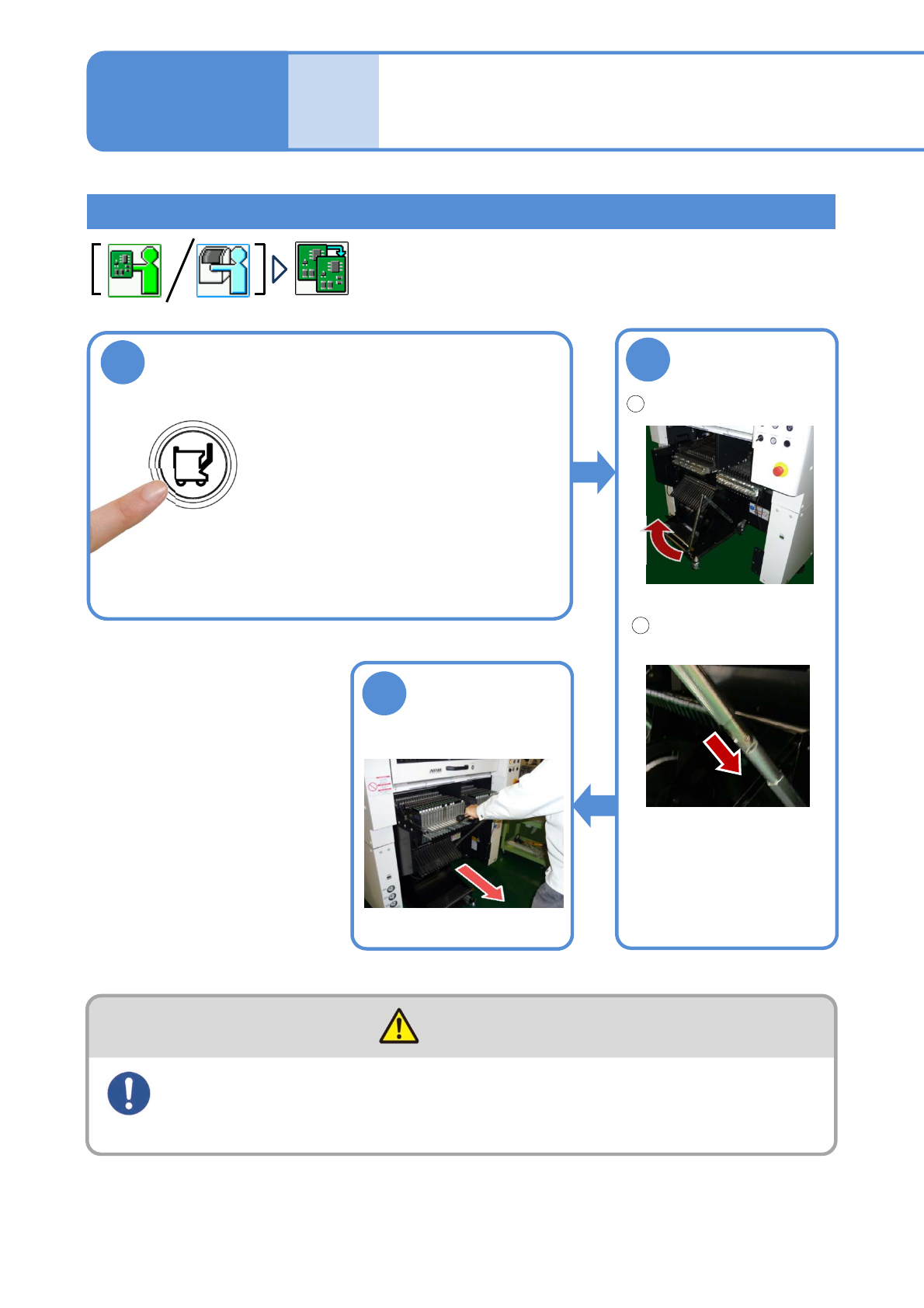 NPM-TT2 EJM1EJ-MB-0 3M-02 3-2 -2 取り付け方法 1 2 パイプを引きあげる 3 秒以上押す 交換台車を取り付ける ( ランプが点灯から点滅に変 わり、本体設備に固定が可 能になる ) 3 ハンドルを戻す ハンドルを戻す ※ セットするときに、 フィーダー用電源ケーブ ルを挟まないように注意 してください。 ※ ハンドルを戻すときに、フィーダー用電源ケーブ ル を挟まないように注意してください。 1 2 ●…