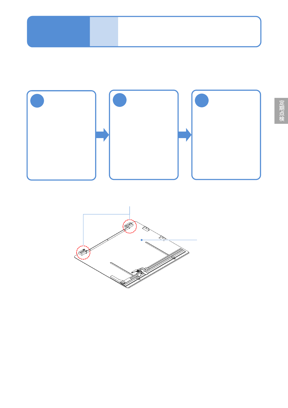 NPM- TT2 EJM1EJ-MB-04M-00 パレット上面 ( 全 面 ) を清掃する 随時 使用工具:ウエス 所要時間: 2 分( 1 点当り) 引き出しブロッ ク部を目視点検 する パレットに反りが ないか、目視点検 する 引き出しブロック部 パレット上面 ●ひびや欠けがある ときは、使用しない。 ●反りがあるときは、 矯正する。 パレットの清掃・点検 (トレイフィーダーパレット(オプション)) 2 1 3 4-3-1 -1 …