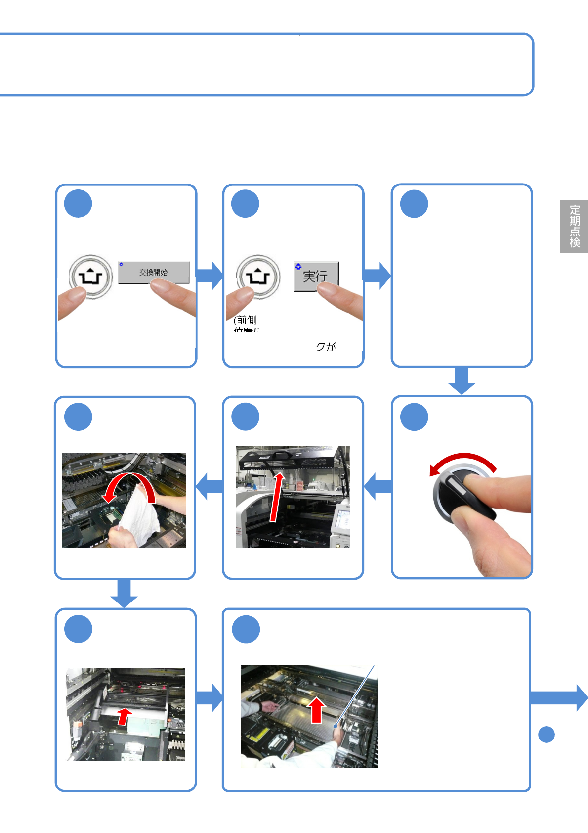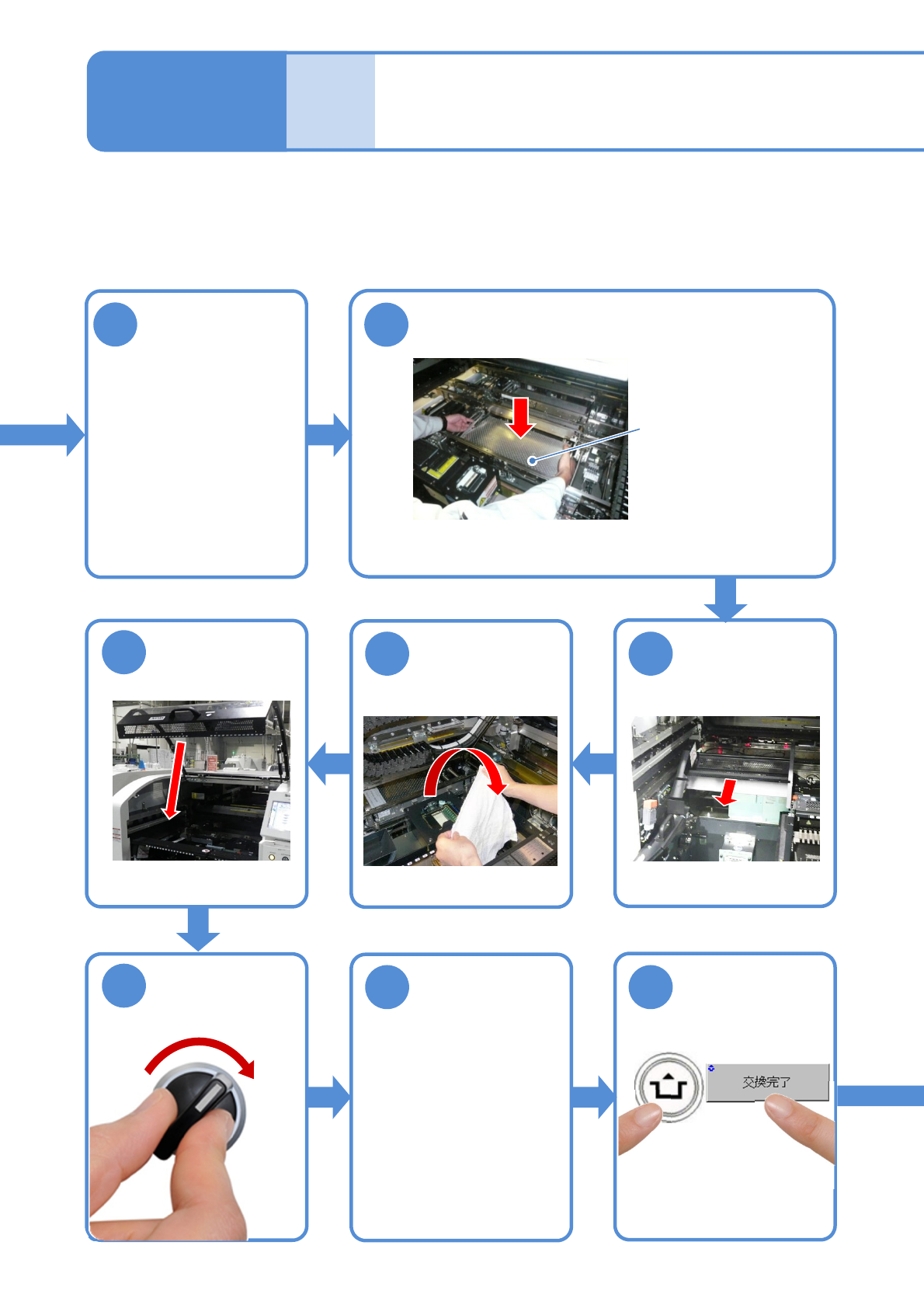 NPM- TT2 EJM1EJ-MB-05 M-03 9 基板ホルダーと、 基板下受けブロッ クを清掃する ●基板下受けブロック(自動 交換用)上面は、洗浄剤を しみこませたウエスで清 掃を行う。 ●基板下受けブロック(自動 交換用)上面のコーティン グ材を鋭利なもので傷付 けないように取り扱いに 注意する。 10 基板下受けブロックを傾きがないように取り 付ける (レールとの干渉のおそれ) 12 11 ウエスを取り外す 13 15 1…