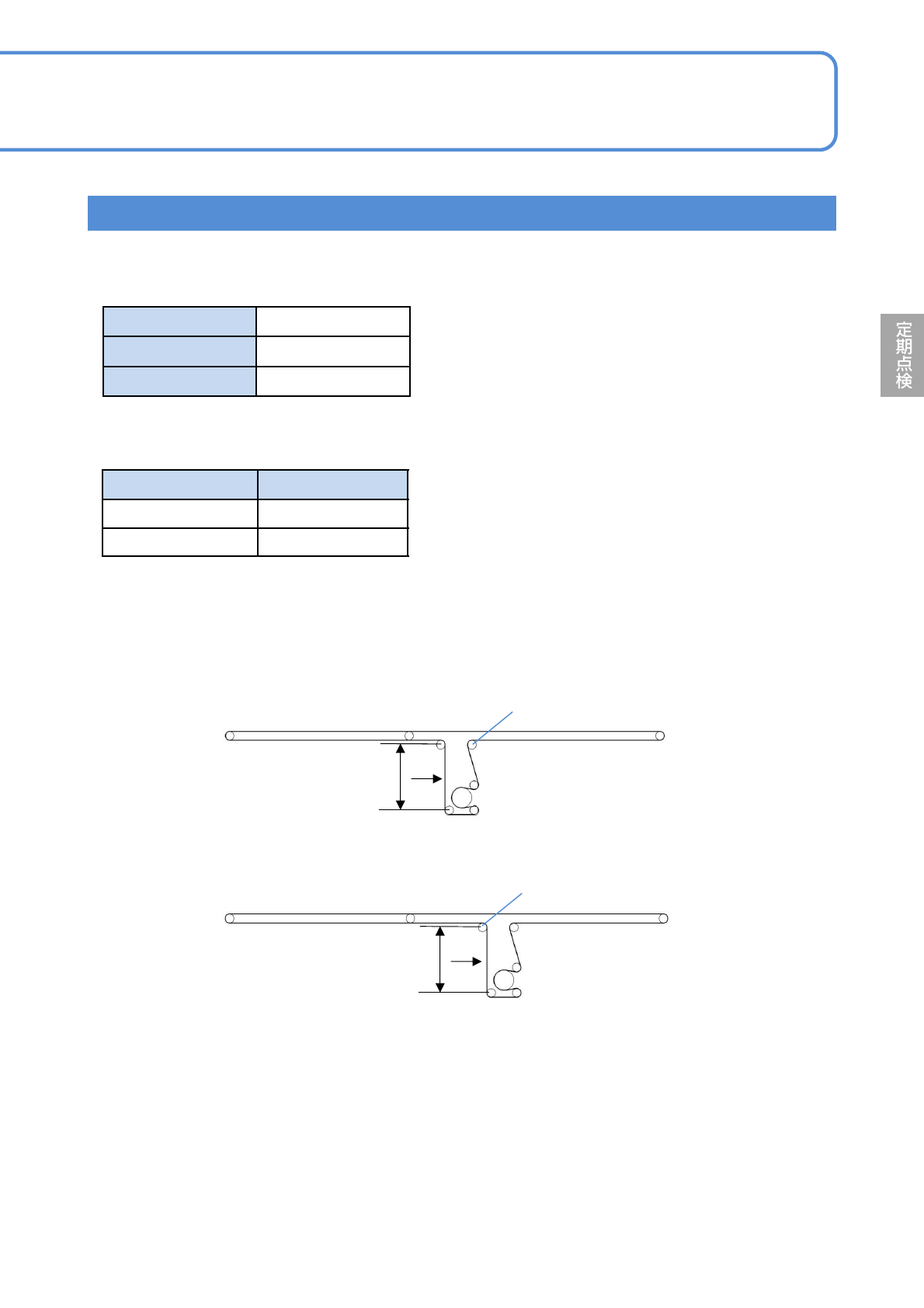EJM1EJ-MB-06 M-02 NPM-TT2 基板コンベヤー部ベルトテンションの点検 6-5 -5 基板/延長コンベヤー (オプション) の点検 3 ●事前に周波数測定器 ( ベルトメーカーなどが提供して いる音波張力計など ) に下記の数値を 入力する。各 スパンの中央部 ( 下図 P 部 ) を指で弾き、周波数測定器で 固有振動数を測定する。 入力値 ●測定値が規格値になるように、テンションプーリ ーを調整、固定する。 実装部…