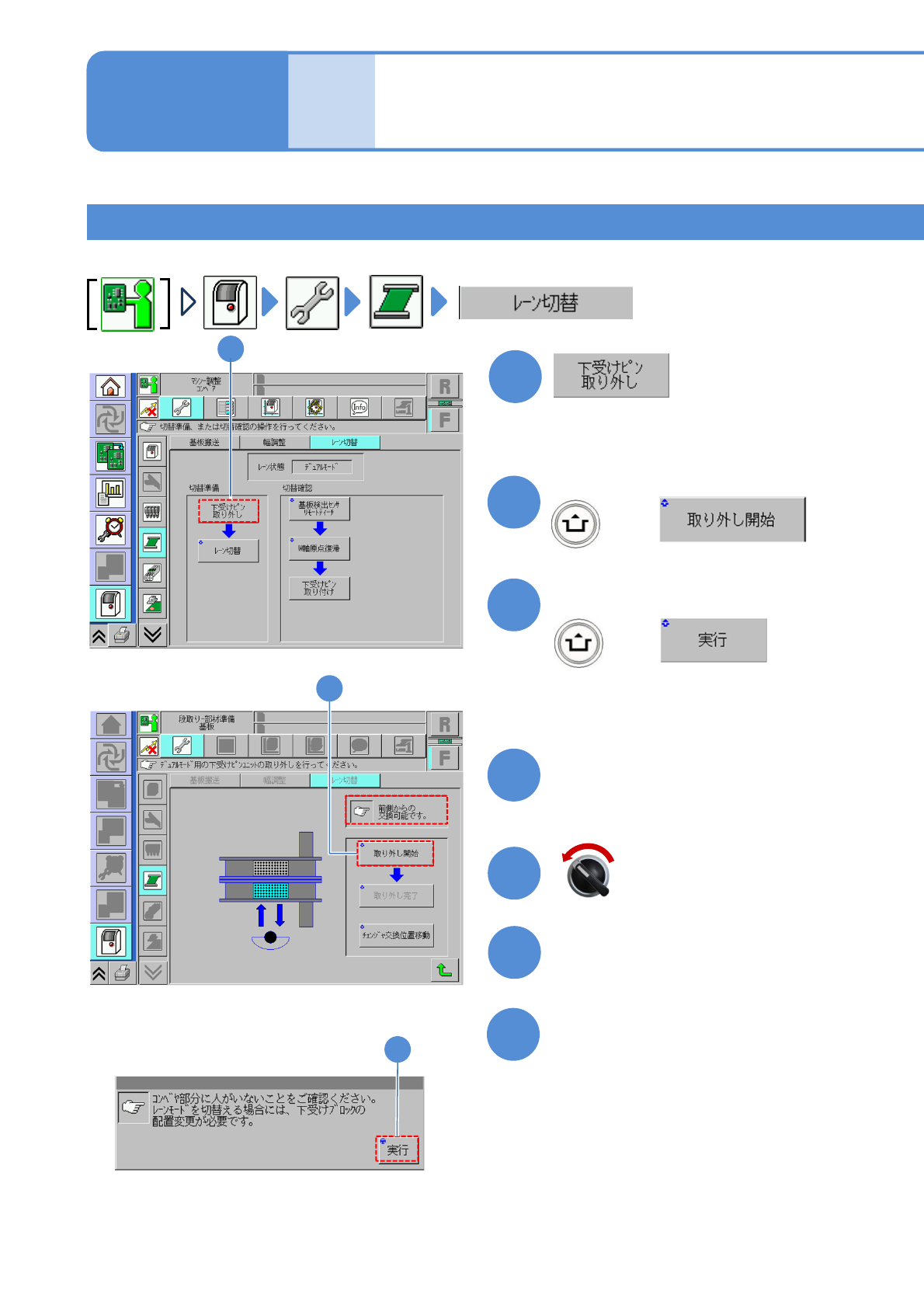 NPM- TT2 EJM1EJ-MB-11M-02 1 1-2-1 -6 8 基板下受けブロックを取り外す ( レーン 1 、レーン 2 とも ) 10 安全カバーを閉じる 11 9 フィーダーテーブルカバーを閉 じる サーボスイッチ ON 基板下受けブロック ②基板下受けブロックを引き抜く。 ①操作側から、左右のレバーを持ち 上げる。 取り出しレバー 取り出しレバー ●両手で上方向にゆっくり取り外す。 ●マルチ認識カメラ (LED 照…