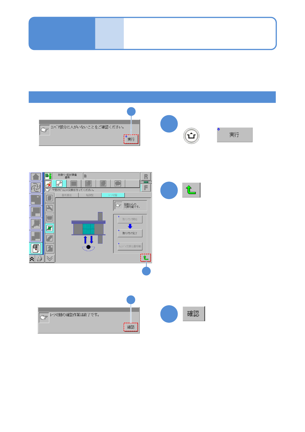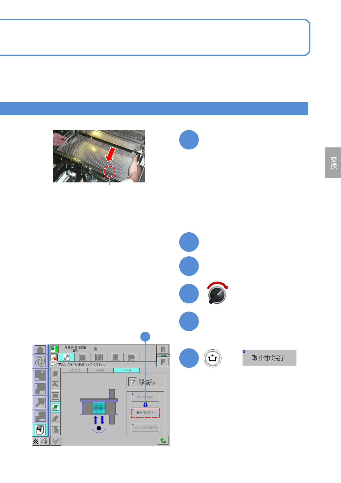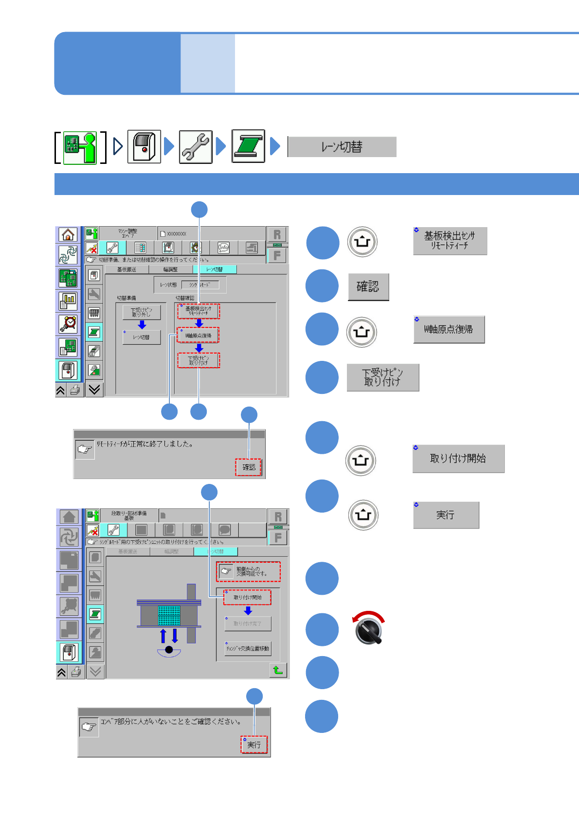 NPM- TT2 EJM1EJ-MB-11 M-02 1 1-2-2 -4 16 + 15 交換台車を取り付ける ( →P.3-2 ) 13 安全カバーを閉じる 14 12 フィーダーテーブルカバーを閉 じる 16 11 基板下受けブロックを取り付ける ( レーン 1 、レーン 2 とも ) サーボスイッチ ON ●本体側のガイドピンと基板下受けブ ロックの穴を合わせる。 ●基板下受けブロックの交換、または 配置位置の変更を行う。基板下…