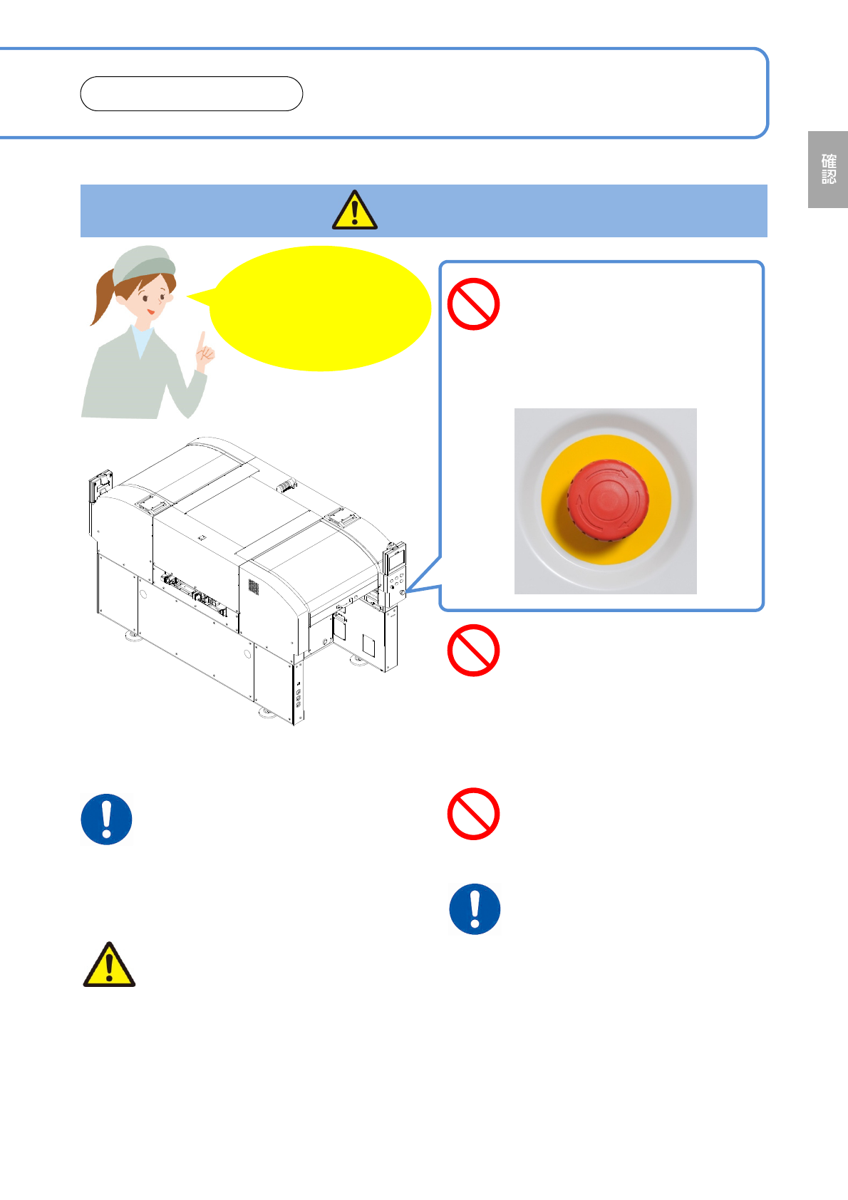 NPM- TT2 EJM1EJ-SF-01N-05 けがや感電 などを防ぐ ために … 非常停止スイッチの周 囲に物を置かない ( 非常時にスイッチが押せず、緊急停 止できないことによる、事故の原因 ) 1-1 -8 「安全データシート (SDS) 」 (別冊)の注意を守る ( 化学物質による、危害や損害の原因 ) ●別冊の「安全データシート (SDS) 」を ご覧ください。 メンテナンスのときは、作業 帽子またはヘルメットと防護 メガ…