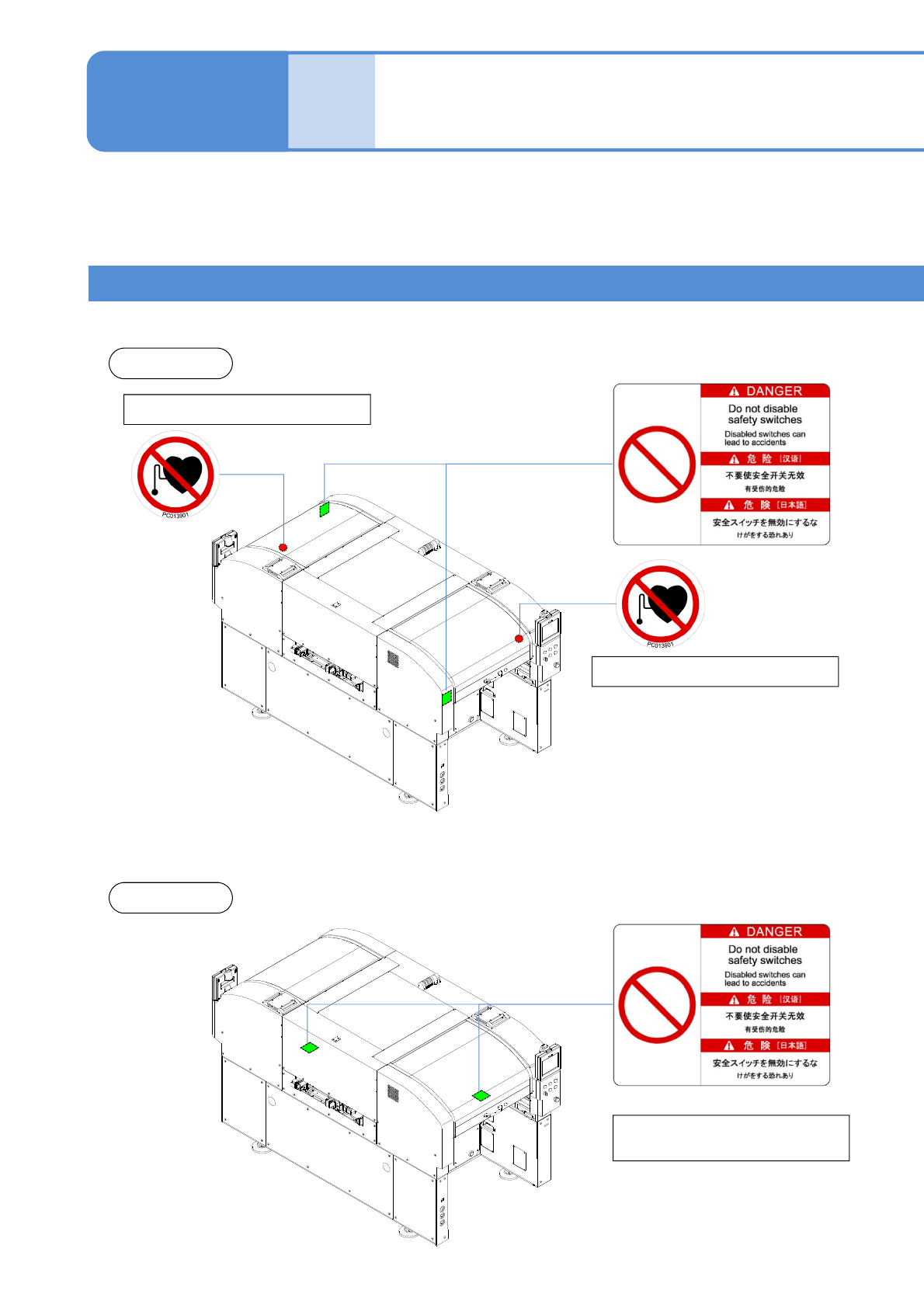 はがれているときは、パーツリストのラベル品番を参照のうえ、当社にご注文いただき、正しい位置に貼り