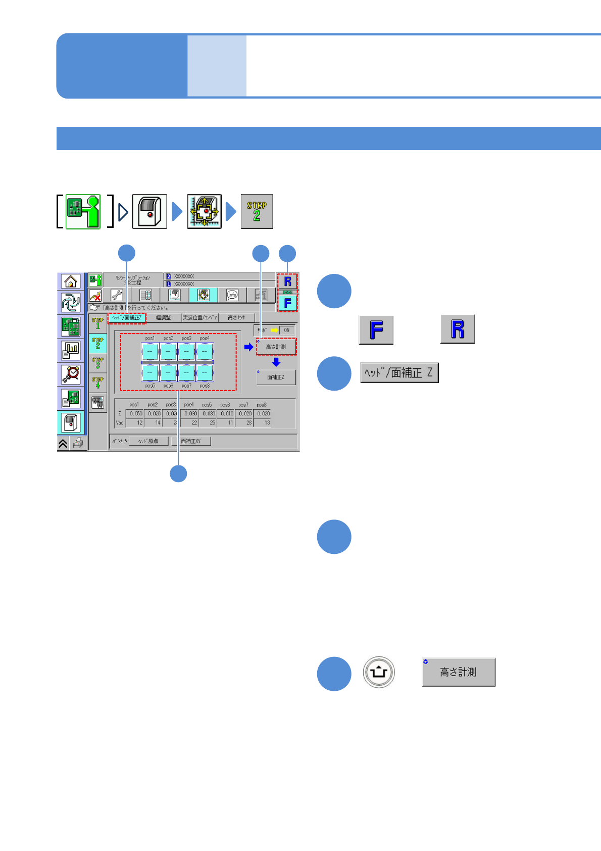NPM- TT2 EJM1EJ-MB-13 M-02 2 ヘッド / 面補正 Z 1 キャリブレーションをするヘッ ドを選ぶ + ( ヘッドが作業位置に移動する ) 2 8 ノズルヘッドでヘッド / 面補正 Z のキャリブレーションの方法を説明します。 3 ノズルヘッドとも共通です。 装着ヘッド 1 3 4 1 4 13-4 -1 1 3 高さ計測をするノズルポジショ ンを選ぶ ●初期画面はすべてのノズルポジション が選ばれている。キャ…