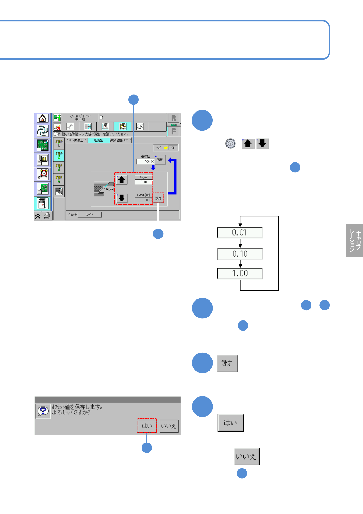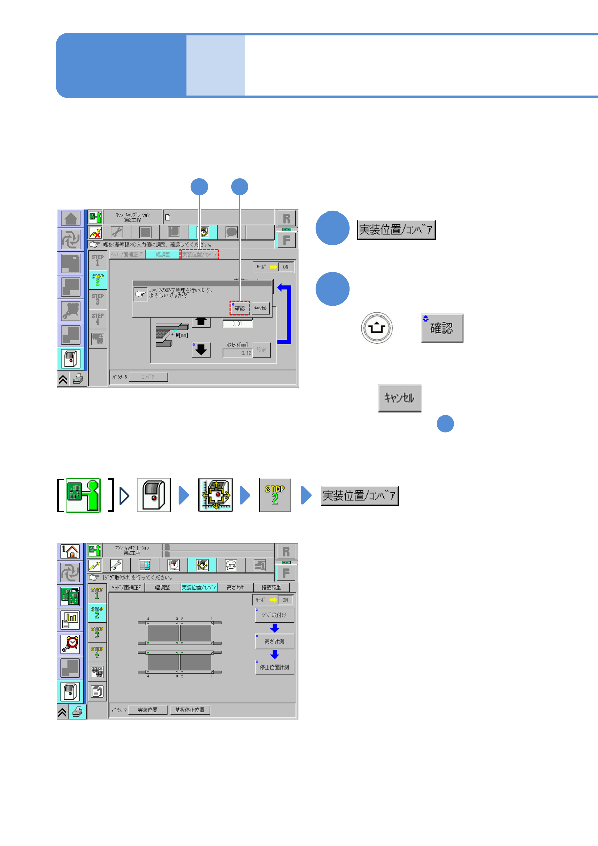 NPM- TT2 EJM1EJ-MB-13 M-02 2 1 装着位置 / コンベヤー 1 13-6 -1 操作方法は、 8 、 3 ノズルヘッドと も共通です。 コンベヤーの終了処理を確認して + ( キャリブレーションが行われる ) ■キャンセルするとき (P.13-5-2 の画面のまま ) 9 1 2 ■前工程で幅調整を実行したとき ■前工程で幅調整を実行しなかったとき メンテナンス 編 13-6