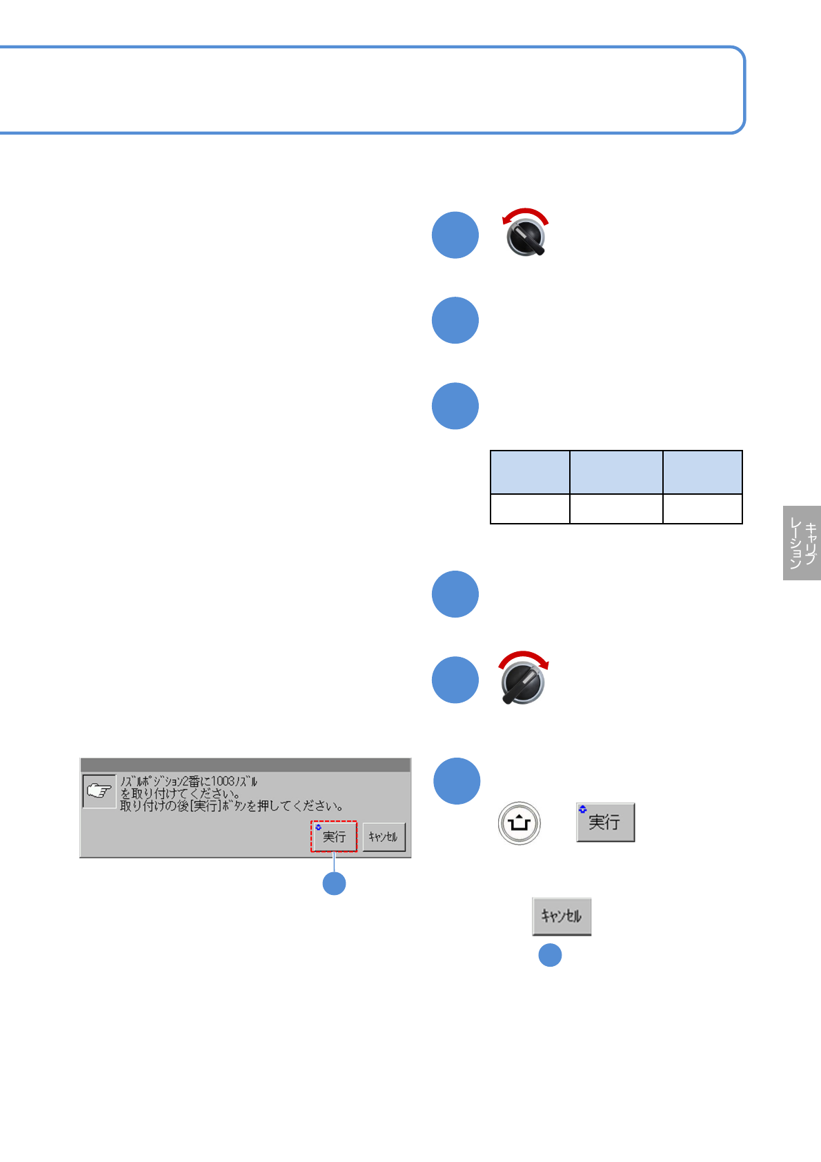 NPM- TT2 EJM1EJ-MB-13 M-02 13-14 -2 サーボスイッチ OFF 安全カバーを開く 6 5 7 9 サーボスイッチ ON 8 安全カバーを閉じる ノズルを取り付ける ●使用するノズル ヘッド タイプ ノズル ポジション ノズル 種類 3 2 番 1003 10 ■キャンセルするとき ( の画面のまま ) 1 + メッセージを確認して 10 ( キャリブレーションが行われる )