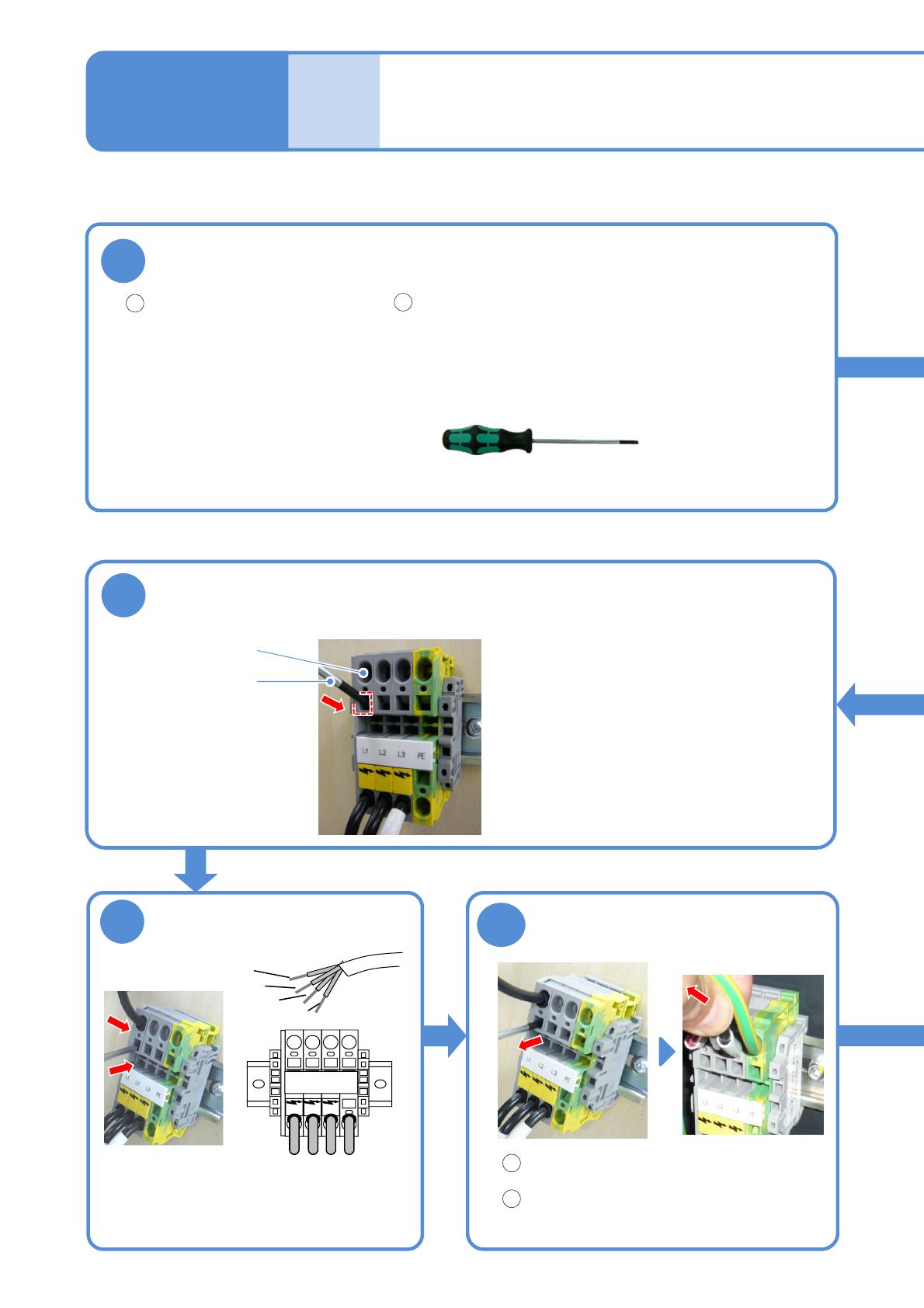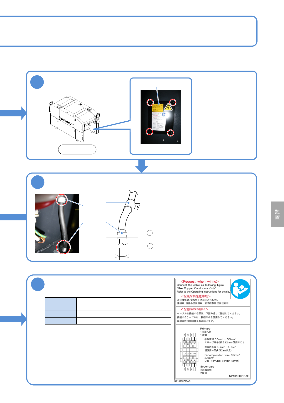 NPM- TT2 EJM1EJ-MB-14 M-02 主電源 の接続 主電源の接続 14-4-2 -1 1 ケーブルを用意し、端末処理をする 4 芯ケーブルを用意する。 ●断面積 : 3.5 ~ 5.5 mm 2 ●推奨スリーブ端子 ・製造メーカー : フェニックスコンタクト ・型式 : 3.5 - 4.0 mm 2 Al4-12GY 5.5 - 6.0 mm 2 Al6-12YE 使用工具:プラスドライバー (No.2) 、付属の専用…
