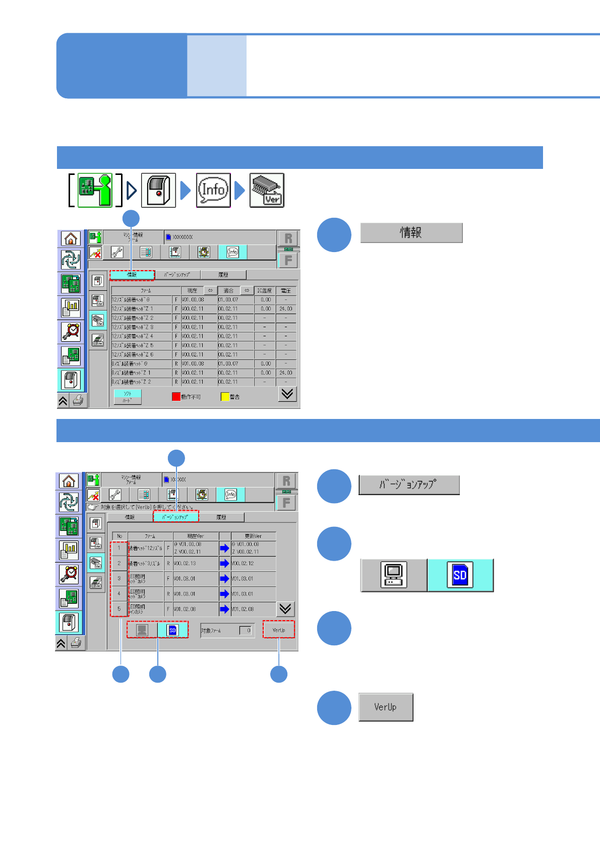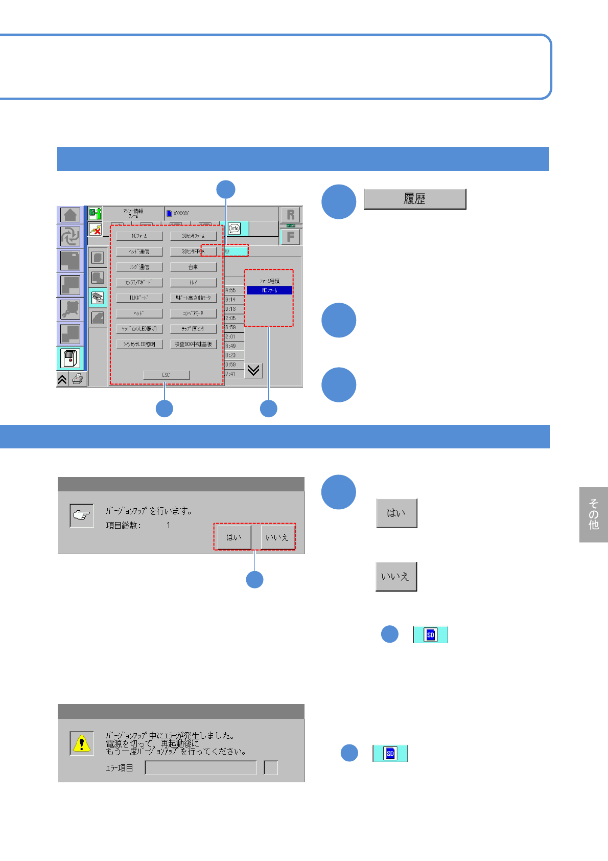 NPM- TT2 EJM1EJ-MB-15 M-00 15-2-2 -2 1 バージョン履歴 1 2 ■バージョンアップに失敗したとき メッセージを確認して 5 5 ( 過去にバージョンアップしたときの バージョン名が、更新日時が表示され る ) 2 ■ファームの種類を変更するとき 画面に触れる (入力画面が表示される) 3 ファームを選ぶ 3 ●バージョンアップが中断されると、再起動 を促すメッセージが表示される。電源を入 れ直してバ…