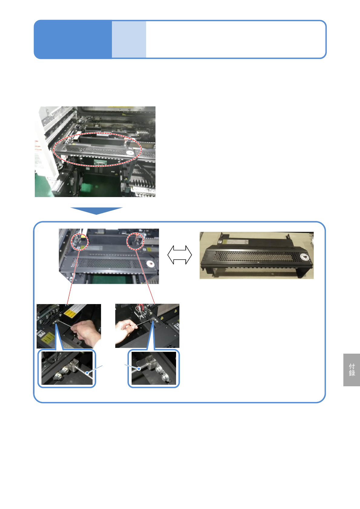 NPM- TT2 EJM1EJ-MB-17 M-00 メンテナンス 編 17-2-3 切替 準備 17-2-3 フィーダーテーブルカバーの 着脱方法 ここでは、 17連交換台車とトレイフィーダーの交換手順の共通工程について説明しま す。 ( 左右にねじ (M4)1 個ずつ ) 六角レンチ (3 mm) 本体に取り付けた状態 外した状態のフィーダーテーブルカバー
