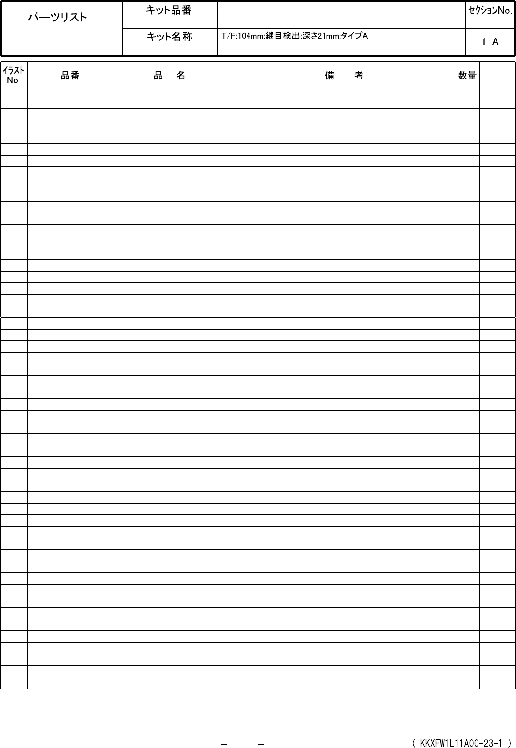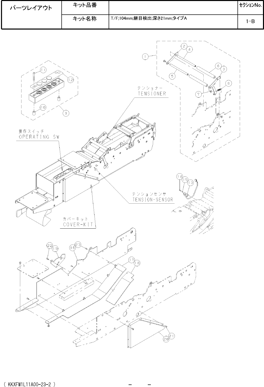 Ref No. Remarks R 1 Q't y Tape Feeder; 104 mm; depth 21mm; Splice sens; Type A Part No. R 2 Kit No. Kit Name KXFW1L11A00 Part Name PARTS LIST Section No. R 3 PRESSER-COVER 1 1 N610002672AB COVER 1 2 KXFA1PR5B01 COVE…