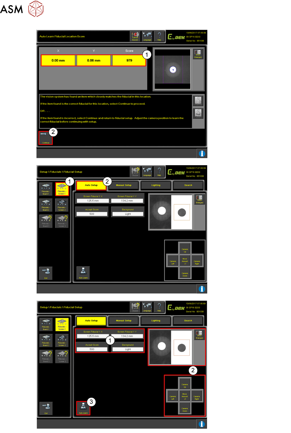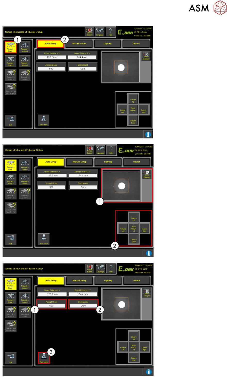10 Fiducial Setup 10.3 Auto Programming Training E by DEK 12/2017 37 1. Click on Fiducial– Board . 2. Click Auto Setup . Use the controls (2) to move the camera so the fiducial is in the centre of the orange box (1). 1…