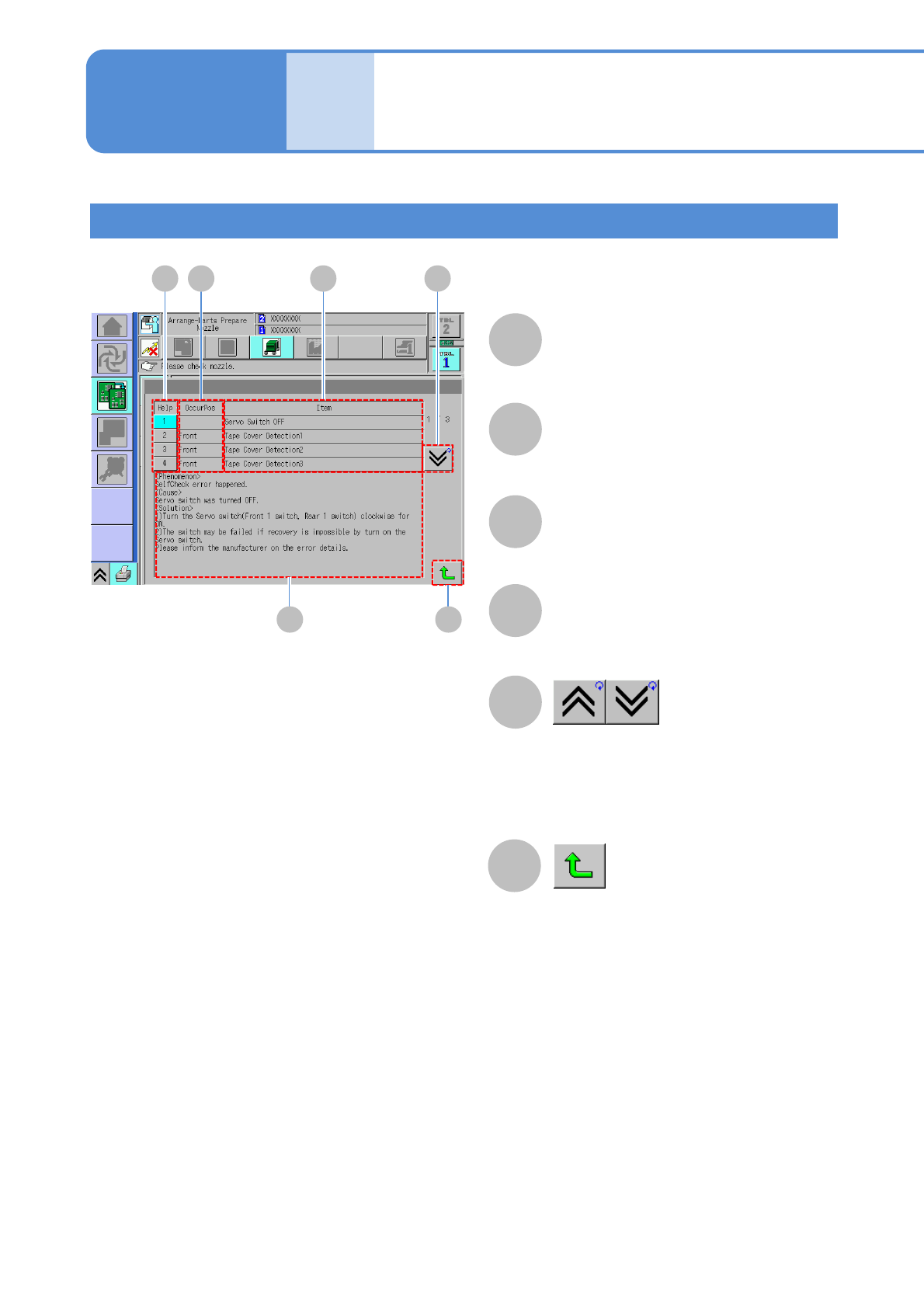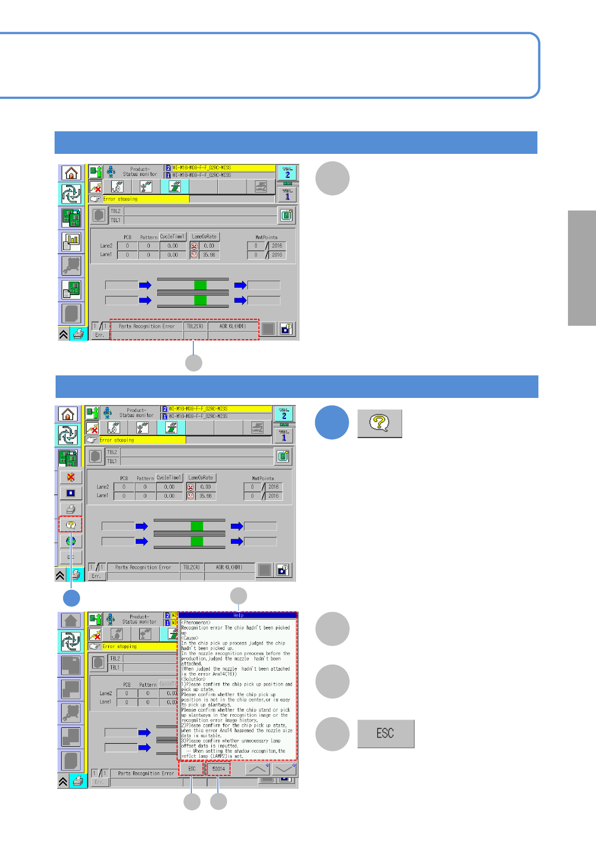 NPM–W 2 EJM7DE-MB-02 -1T-00 Ref . page 2-1-1 -2 Error messages upon single stop error A A 1 Detail display of an error message (The Help window is displayed) B D C B C D Details of errors are displayed on the Help wind…