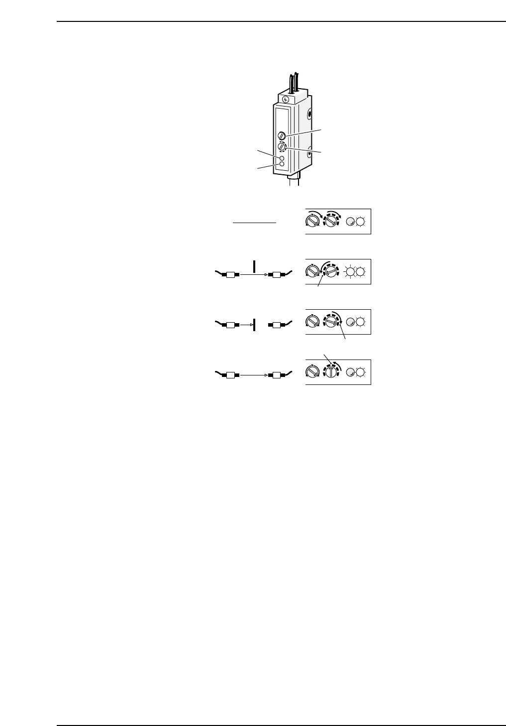Sensor Sensitivity Adjustment 1. Rotate volumes 1 and 2 all the way to the right. 2. Pass the beam to the receiver. Slowly rotate volume 2 to the left until the red LED (position A) lights up. 3. Break the light beam wit…