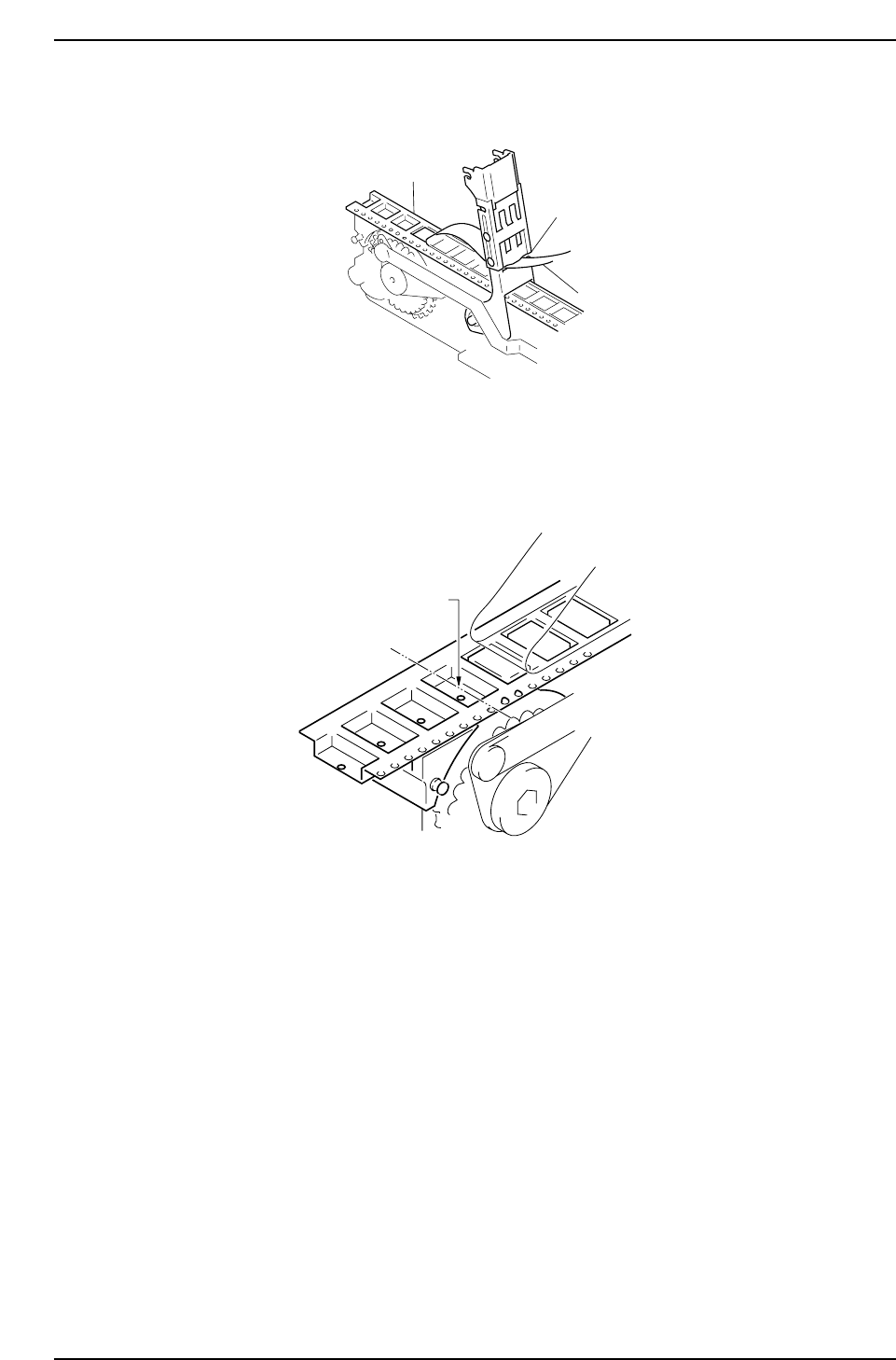 5. Make sure that the feed holes line up with the sprocket, pull the top-film out of the way, lower the tape leaf, and press the catch pins simultaneously to lock the tape leaf into place. Before the tape leaf is complet…