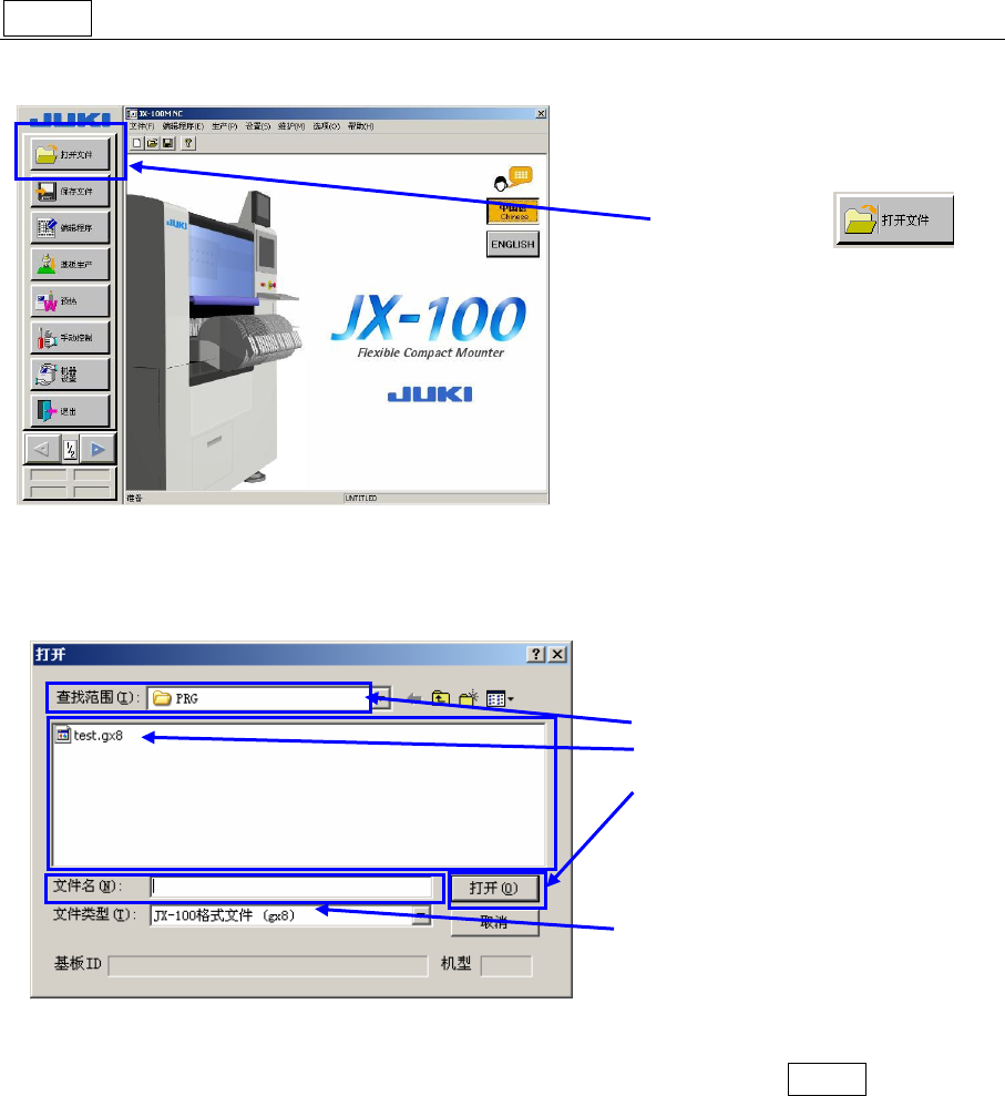 操作手册Ⅰ 4 2- 步骤 3 读入生产程序 ① 选择画面上的按钮。 ② 显示打开文件画面。请选择生产程序,选择[打开]。 * 当基板的宽度与传送轨道的宽度不一致时要调整轨道宽度。调整方法请参见 步骤 5 。 < 顺序 > 1. 选择文件夹。 2. 选择文件。 3. 选择 「 打开 」 。 显示所选择的文件名。 在主画面上选择: