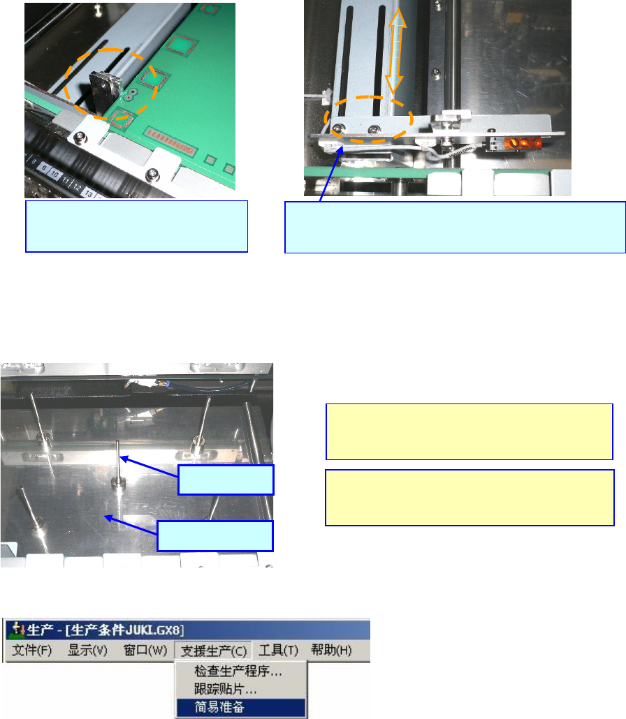 操作手册Ⅰ 8 2- ③ 显示简易准备画面。 ④ 将基板放置在传送装置上以后,在传送个别控制画面里启动「支撑台」 。 ⑤ 请确认支撑销的位置。另外,请用手从上方轻轻按压基板,确认基板已被支撑销支撑住。 请选择「个别控制」 。 1.请选择「支撑台」 。 2.请进行操作使支撑台上升、下降。