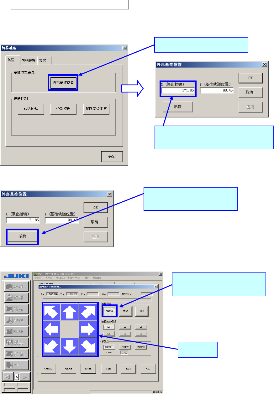 操作手册Ⅰ 10 2- 顺 〈序 5 认进 〉确 外形基准位置、 行示教( 对 准位置)。 在〈顺序 2〉变更了停止挡块位置时,需要进行「外形基准位置」的示教(对准位置) 。 可在操作画面上通过触摸屏进行示教,也可使用 HOD(选购项)进行示教。 ☆ 通过操作画面上(触摸屏)进行操作时 ① 请搬入基板。 ② 从生产画面的菜单栏中选择[支援生产]-[简易准备]。 ③ 显示设置外形基准位置画面。 ④ 从显示有示教按钮的对话框里执行示教。 ⑤…