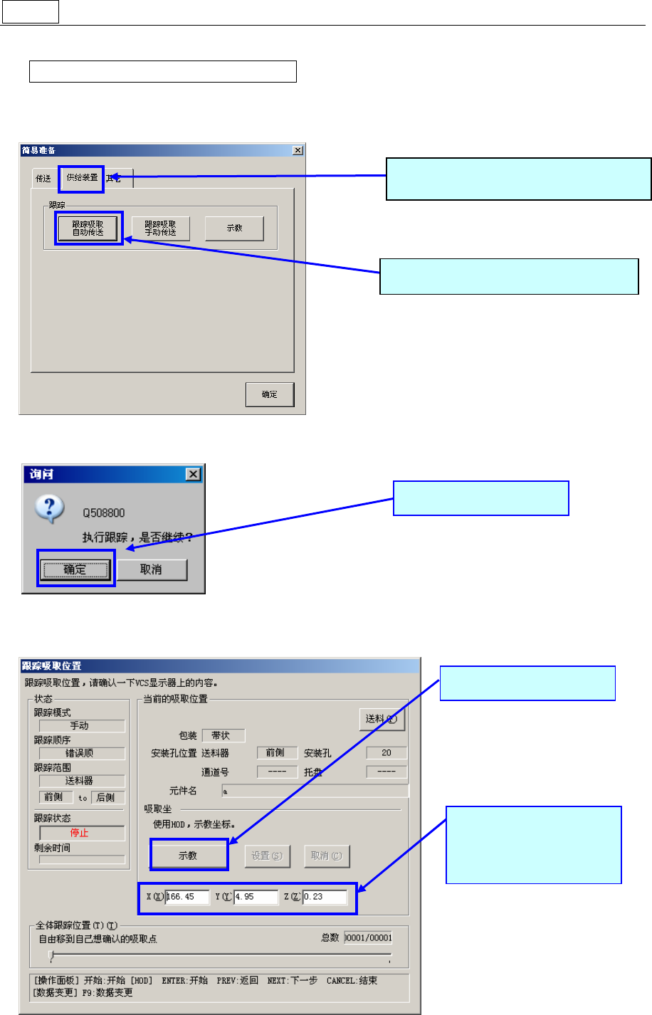 操作手册Ⅰ 14 2- 步骤 8 确认元件吸取位置 可在操作画面上或通过 HOD 对吸取位置进行确 认。 ☆ 通过操作画面上(触 摸屏)进行操作时 ① 从生产画面的菜单栏中,选择[支援生产]-[简易准备]。 ② 选择「供应位置」 ,进行 X,Y(吸取坐标) 、Z(吸取高度)的跟踪。 ③ 显示「跟踪吸取位置」画面。 2.请选择「跟踪吸取自动传送」 。 1.选择「供给装置」 。 3.请选择「确定」 。 请选择「示教」 。 显示 X,Y,Z …