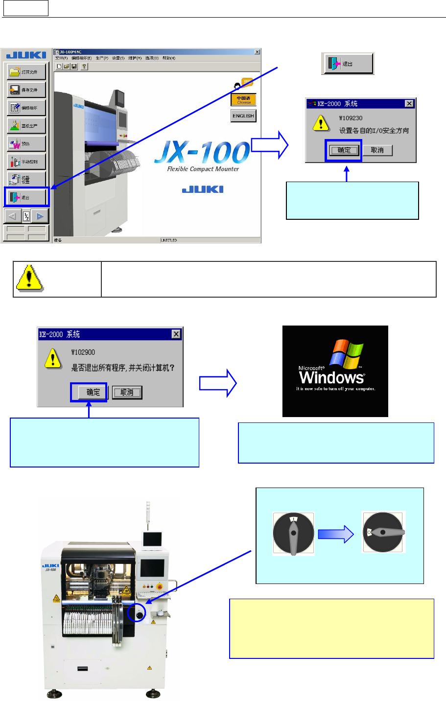 操作手册Ⅰ 20 2- 步骤 11 关闭主机电源 ① 进入主画面。 ② ③ 请把主开关向左旋转切断主机电源。 请选择 「 确定 」 。 开始关闭处理,相 继退出主机软件和 Windows XP 。 退出所有程序后, 显示 “可以安全地 切断 电源”的信息画面。 请把主开关向左旋转 90 度。 <打开电源> <关 闭电源> * 关闭电源后, 请拔出装置内部的支撑销。 并请确认装置内部无留下基板或工具等 其他物体。 选择 「确定」 , 使装…