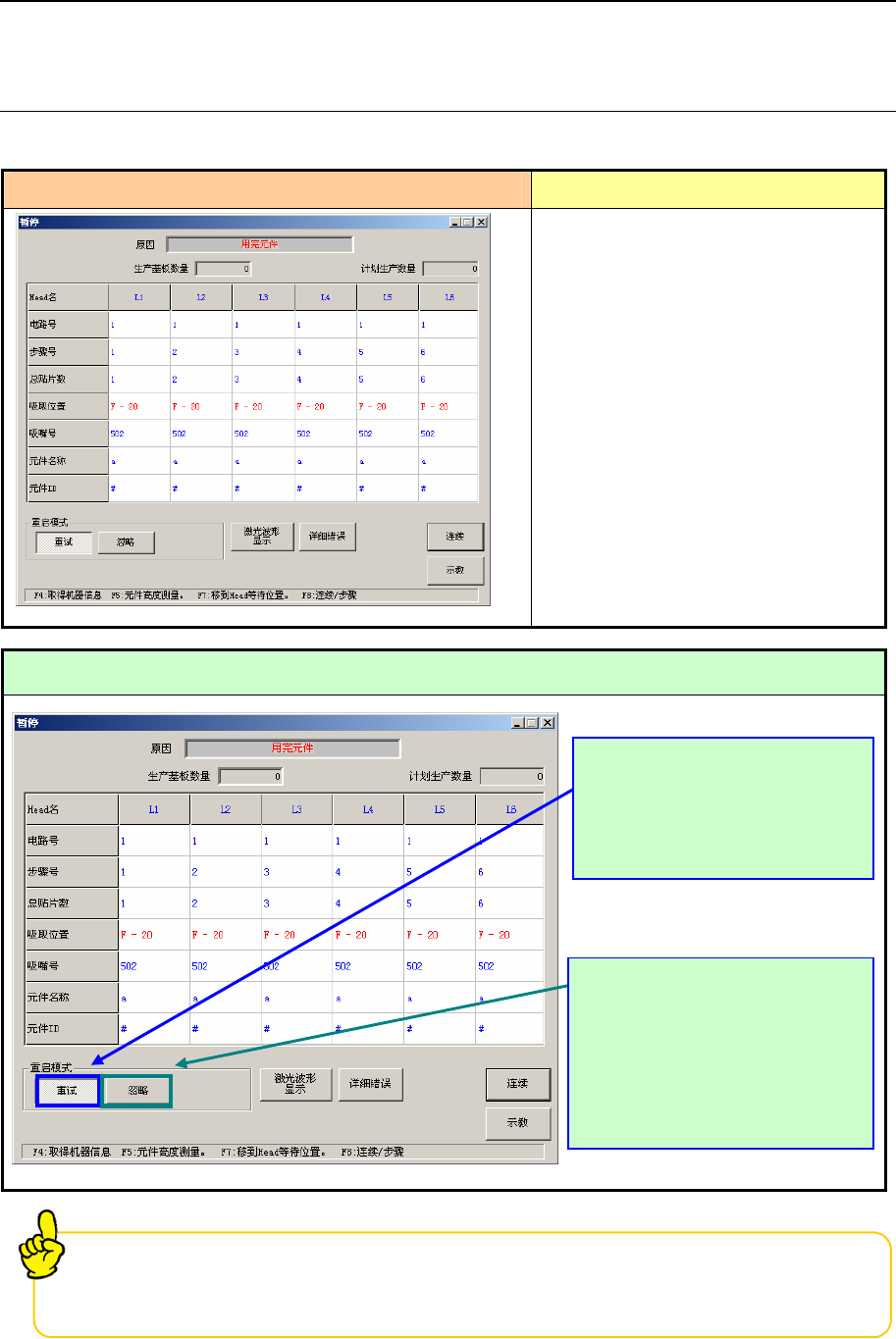 3-1 用完元件(在操作选项中选中“无元件暂停”时)