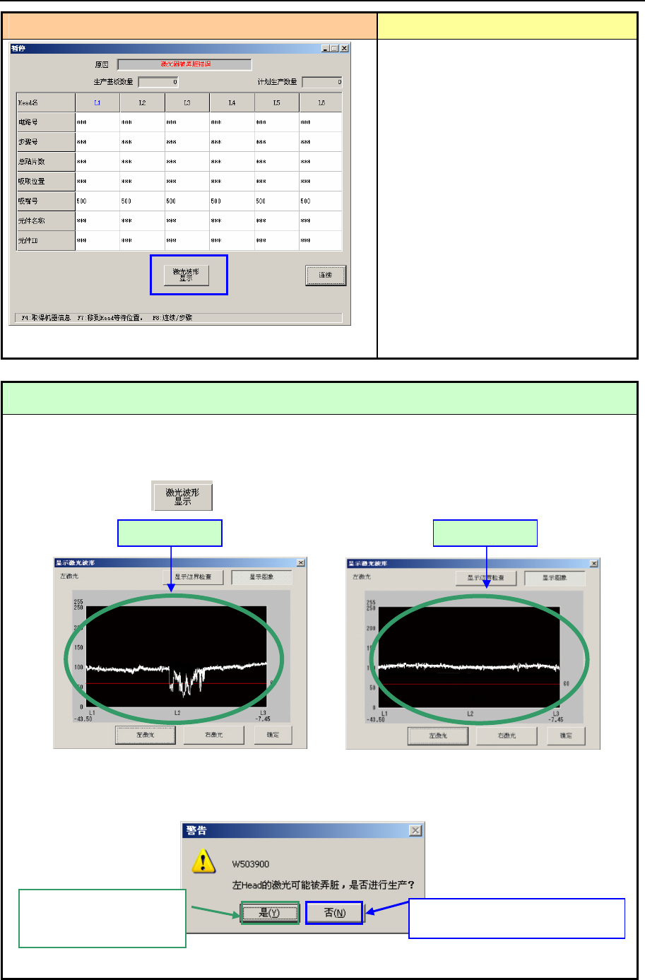 操作手册Ⅰ 4 3- 3-4 激光脏污错误 错误画面 错误要因、原因 如果选中操作选项 “生产(功能 2)” 标 签中的“进行激光传感 器脏污检查” , 则搬入基板时会进行激光脏污检查, 检 测出激光脏污时会暂停。 ①激光视窗有脏污。 ②激光视窗有伤痕。 处理错误的方法 1) 遇到「激光脏污错误」时,贴片头将移动到前面后暂停。 2) 请参照『操作手册Ⅱ』「 5-3-4 激光校准传感器」,清扫激光视窗。 3) 清掃后请按下 ,在「激光波形…