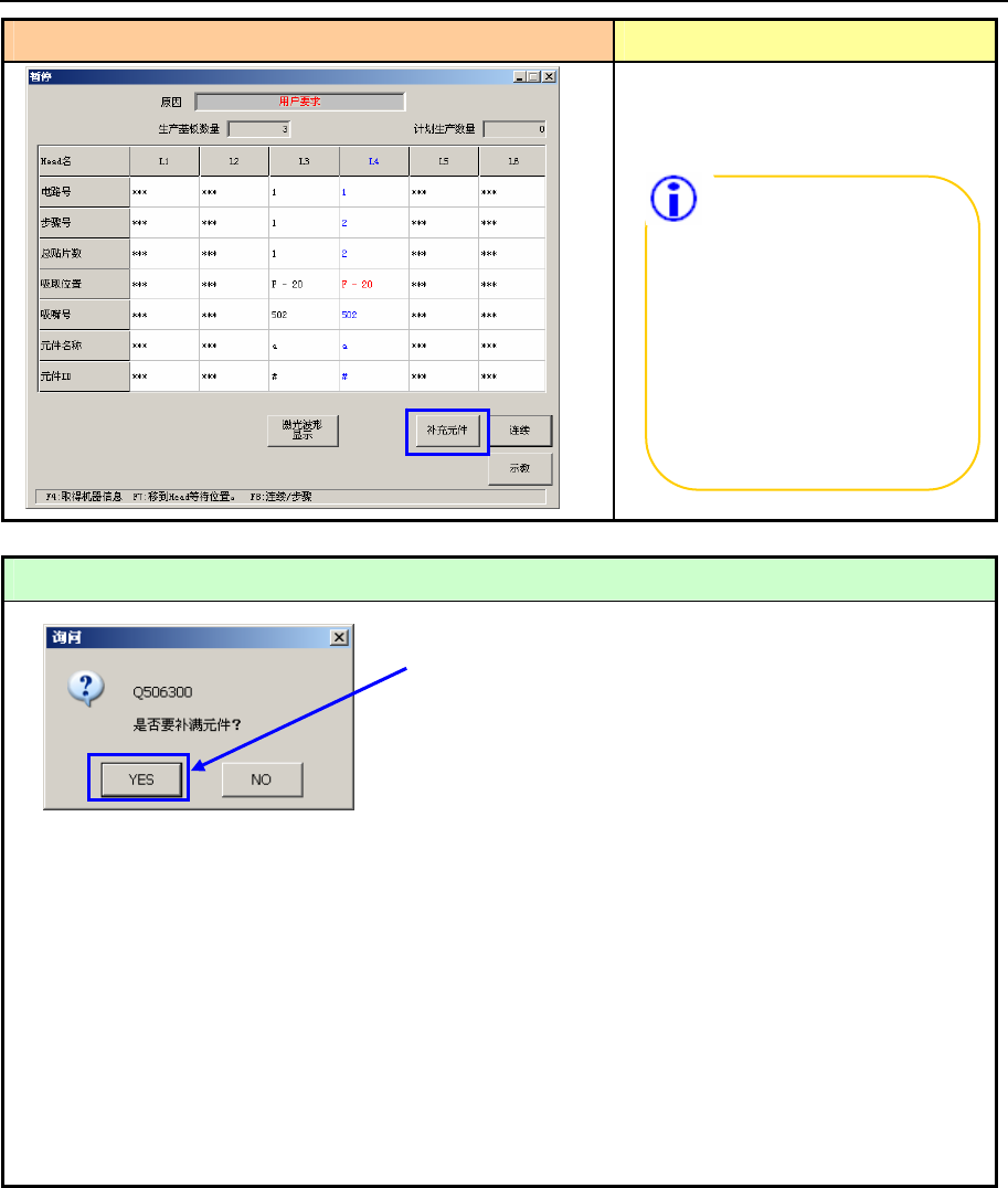 操作手册Ⅰ 7 3- 3-7 暂停时的用完元件补满功能 错误画面 错误要因、原因 ① 送料器的元件用完。 错误处理方法 1)按「补充元件」按钮。 2)点击「YES」则进行补满。 3)元件剩余数量为 0 的,会将剩余数量恢复为初始值 并清除元件用完信息。 尚有剩余数量的则仅清除元件 用完的信息。 ※ 进行补满的元件为,带状、管状、散装元件。 勾选操作选项“生产(暂 停) ” 标签的 “给暂停对话框 增添[补充元件]按钮“时, 当由于“发生…