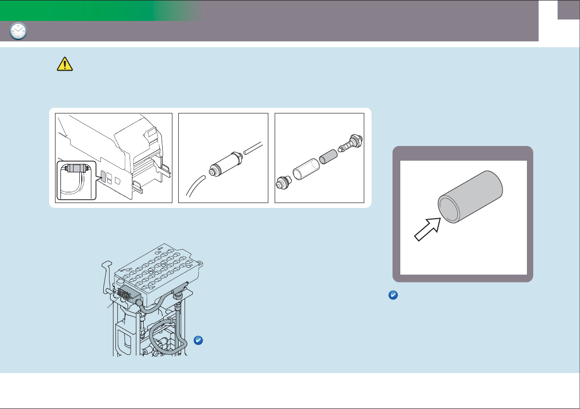 48 每4,000小时(每6个月) 置放台类型清扫刷单元 清扫过滤器 清扫过滤器 作业前请切断机器的主电源。 首先、请分解过滤器。 1. 从模组内取出过滤器。 2. 拔下空气管。 3. 分解过滤器。 过滤器 吹气除尘 污垢严重时,请更换过滤器。 清扫后,请按照与拆卸相反的步骤安装。 未搭载置放台类型清扫刷单元的模组 不需要进行此项作业。 置放台类型 清扫刷单元 注 意 注 意