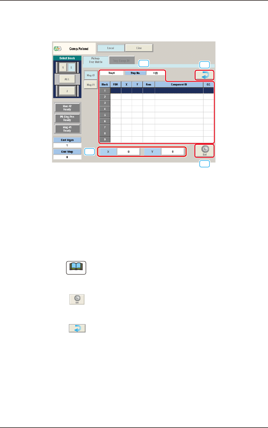 OM-1754 2-6 [4] Step Selection Buttons When a magazine and a step are selected, the "Block Information" window appears, making it possible to check and change the tray matrices. [5] [6] [7] [7] "Block Info…