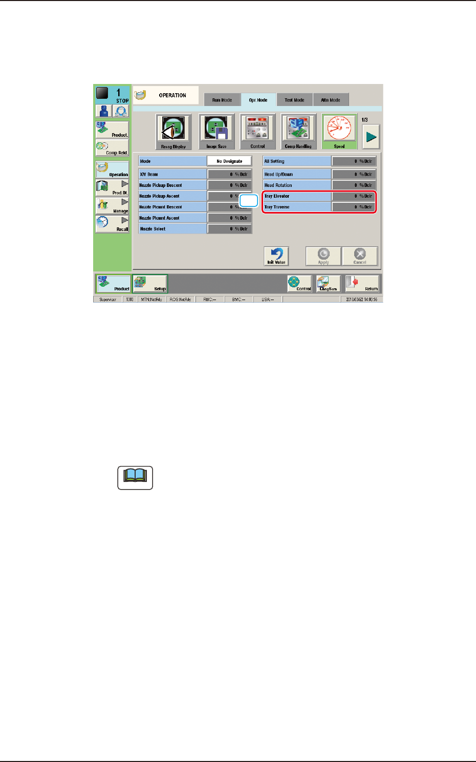 OM-1754 2-9 2.3.1 "Opr .Mode" T ab Sheet When the [Speed] button is pressed in the "Opr.Mode" tab sheet the following window appears. [1] "Opr.Mode" tab sheet (1/3) FB9 [1] T ray Elevator Th…