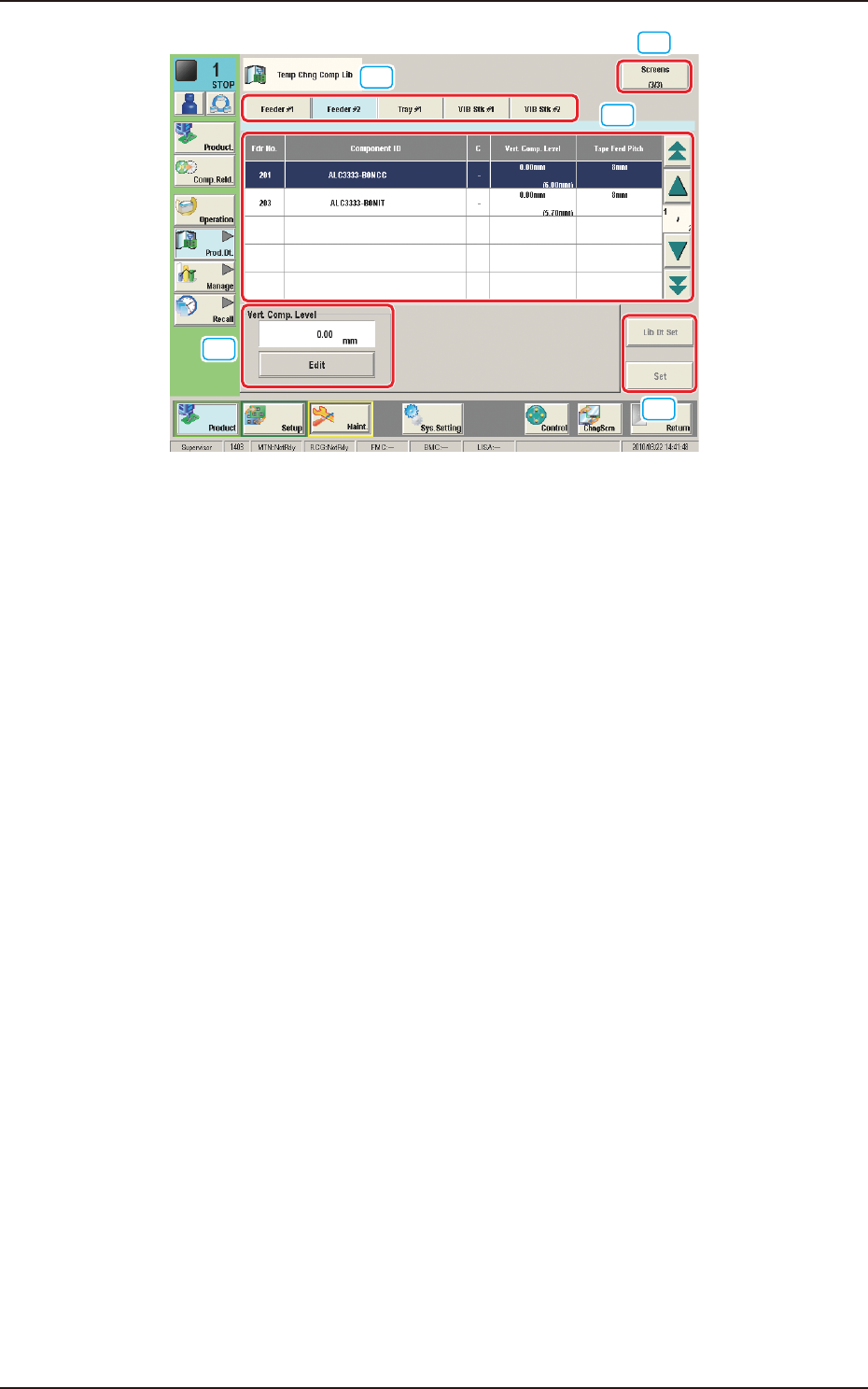 OM-1754 2-25 2.4.6 "T emp Chng Comp Lib" Window This window enables the operator to check and change the component carriage data for the production model. [1] [2] [3] [4] [4] "Comp Crg Dt Edit" window…