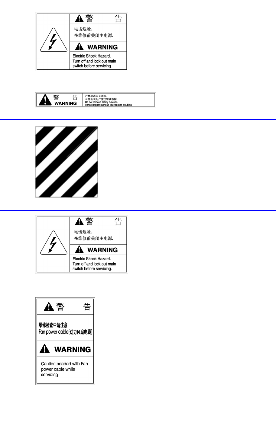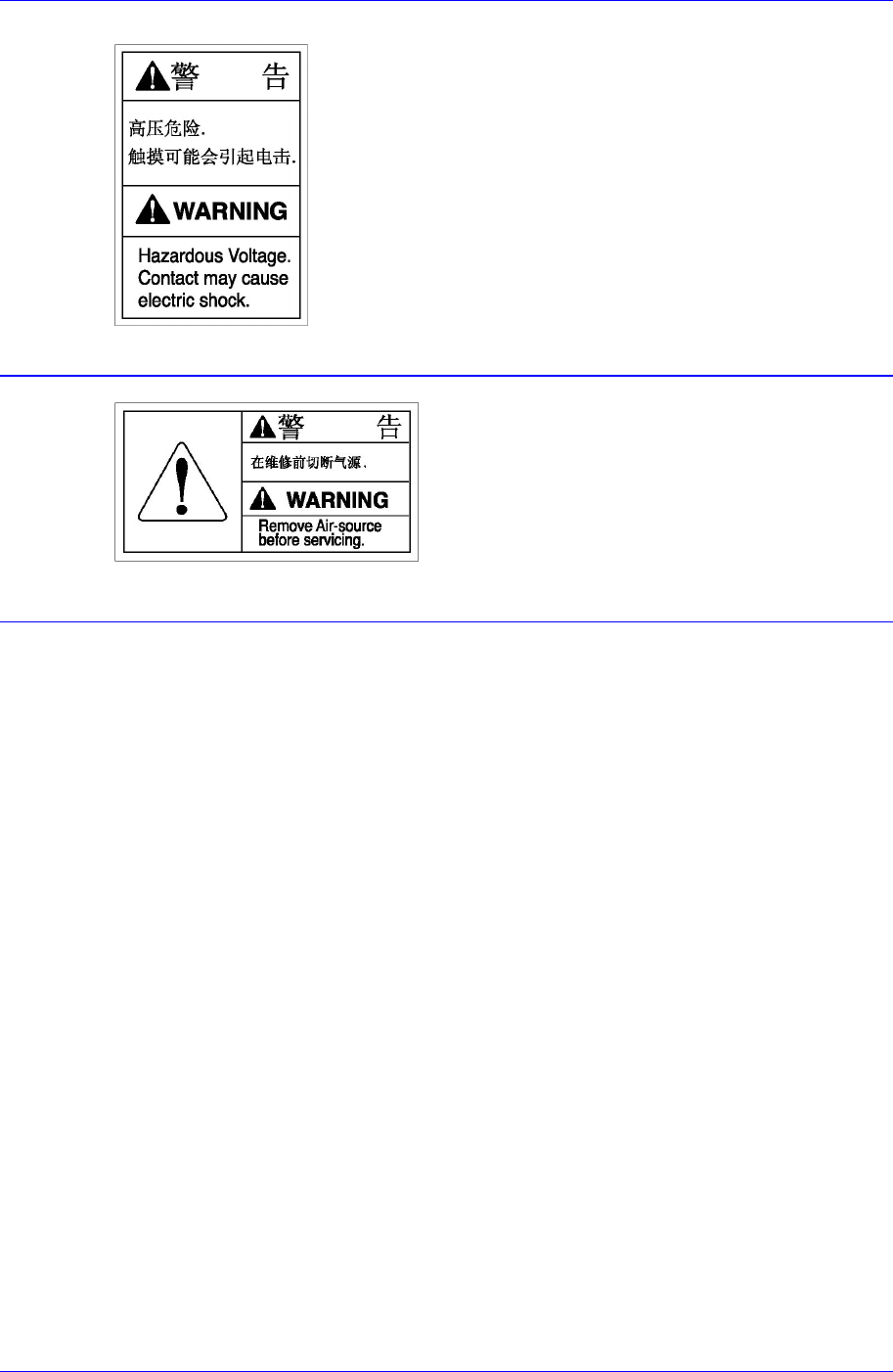 Samsung Component Placer SM310 T r oubleshooting Guide viii 设备维护及修理前要切断电源和空气。 如果将贴有此标签的盖子 移掉,可能会产生 电击。 如果在维护修理设备时需要移开盖子,必须 先切断主电源,等一会儿后移开盖子。
