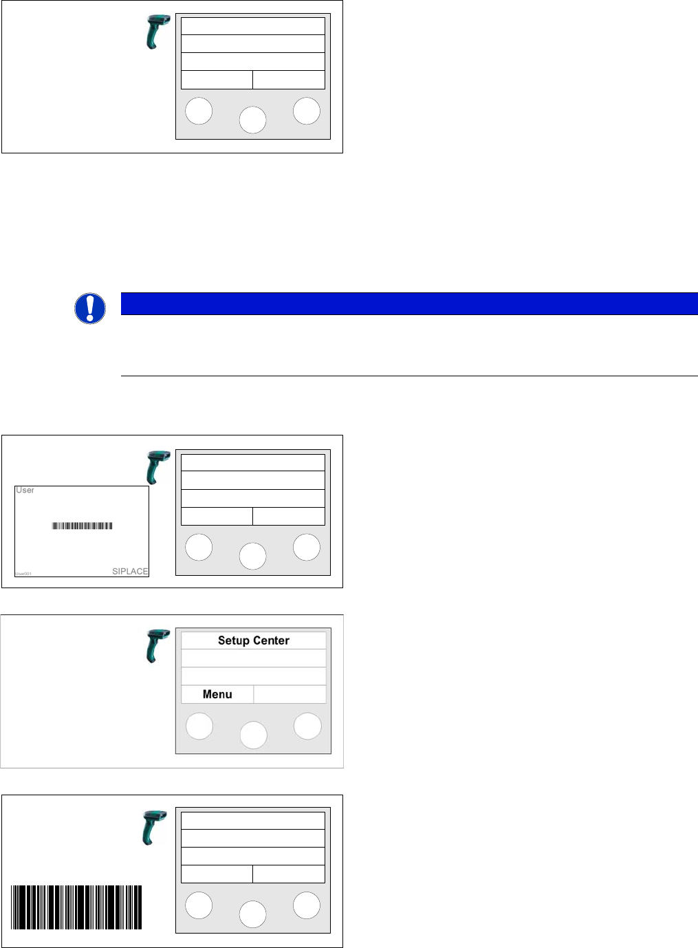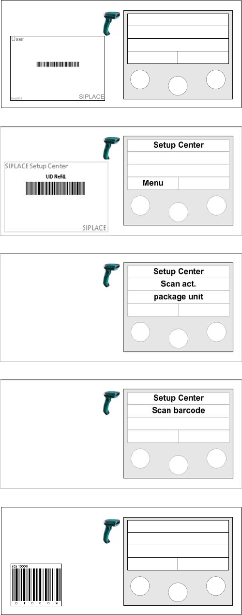 Setup Verification in Practical Cases Using the Scanner (Steps with UID) Re filling a Track for Online Setup Verification User Guide SIPLACE Setup Center 5.1 17 1 Step 1 (optional) Scan in the the Us er if the User regis…