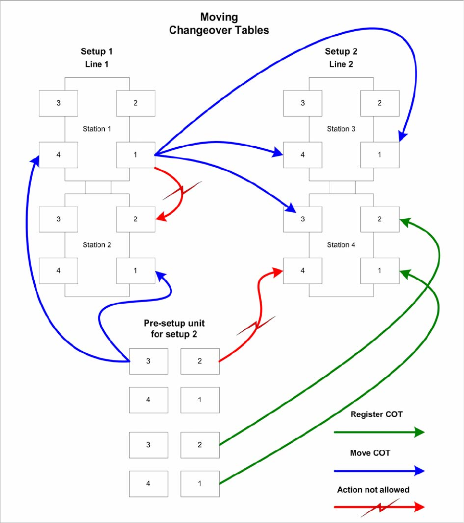 ▪ The red arrows show that moving changeover tables to locations at other stations in the line is not